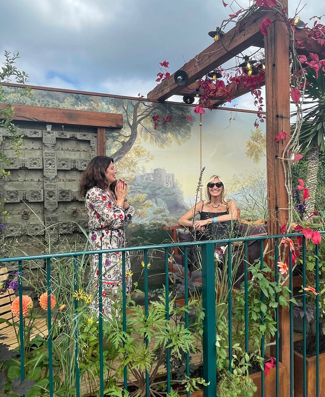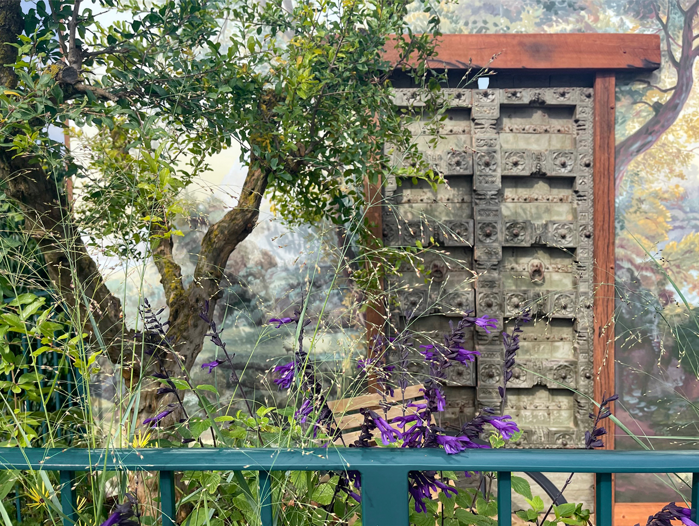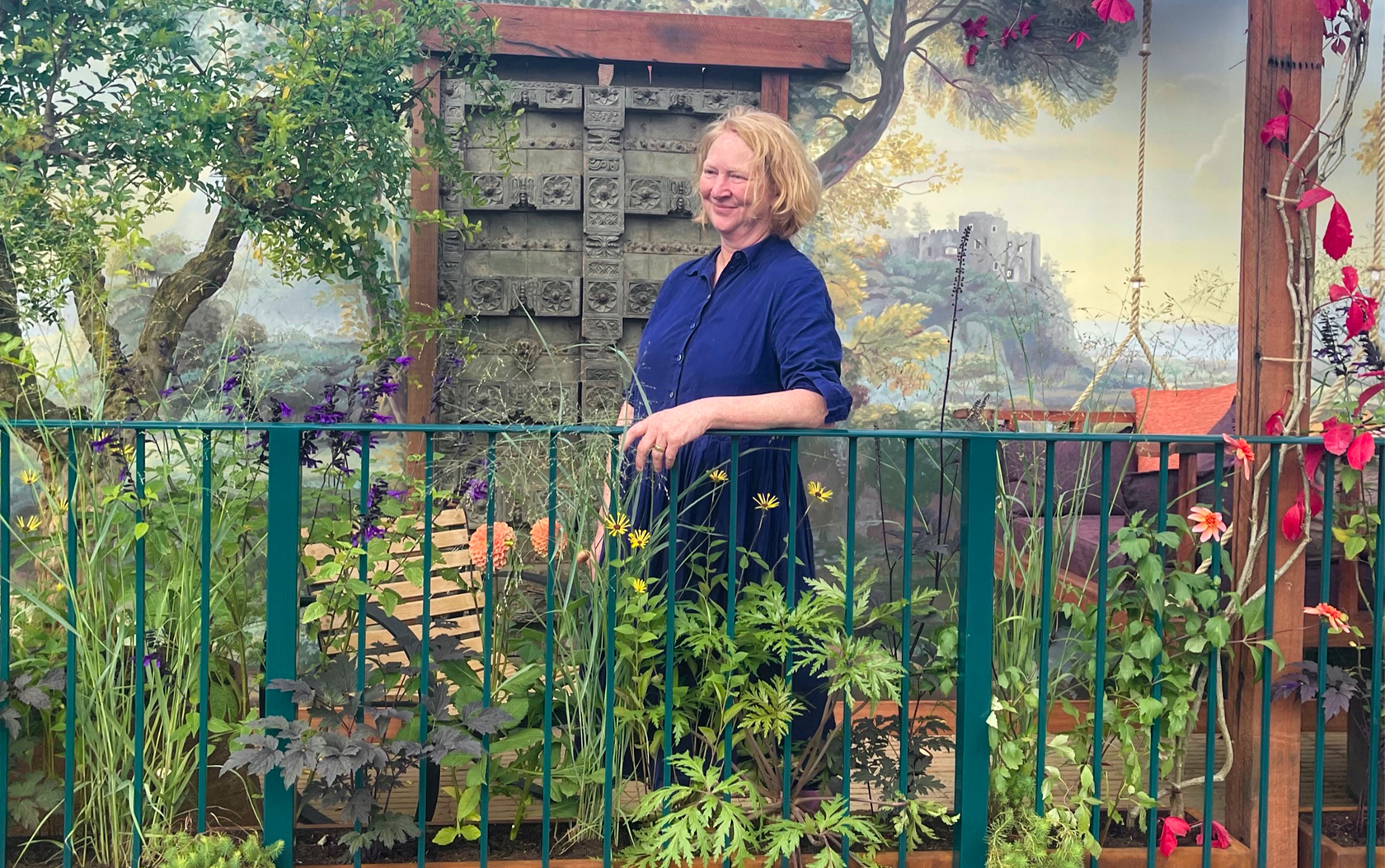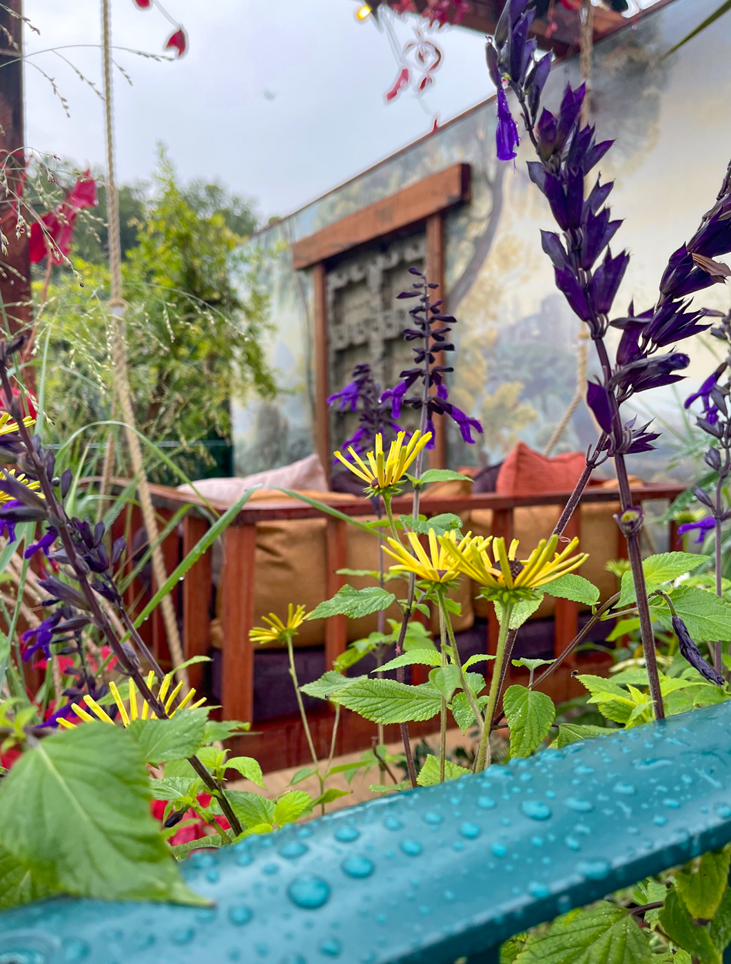 Martha Krempel’s ‘Arcadia’ was a knockout. The centrepiece – some old Indian doors – sets the scene. An antique-dealer client acquired a container of old Indian doors that had been lying around for 20 years; Martha loved them and used them to replace the RHS standard-issue ones. The pergola over the swing seat is covered with the bright red leaves of Parthenocissus quinquefolia; it is trained by strings threaded through carefully drilled holes in the timber. The painted backdrop on the “building” walls was subtle but helped transform the space. Autumnal colours are taken on to the cushions as well as in the planting. The abundance of foliage, thought and creativity of these five spaces will no doubt influence many balcony owners to revamp theirs.