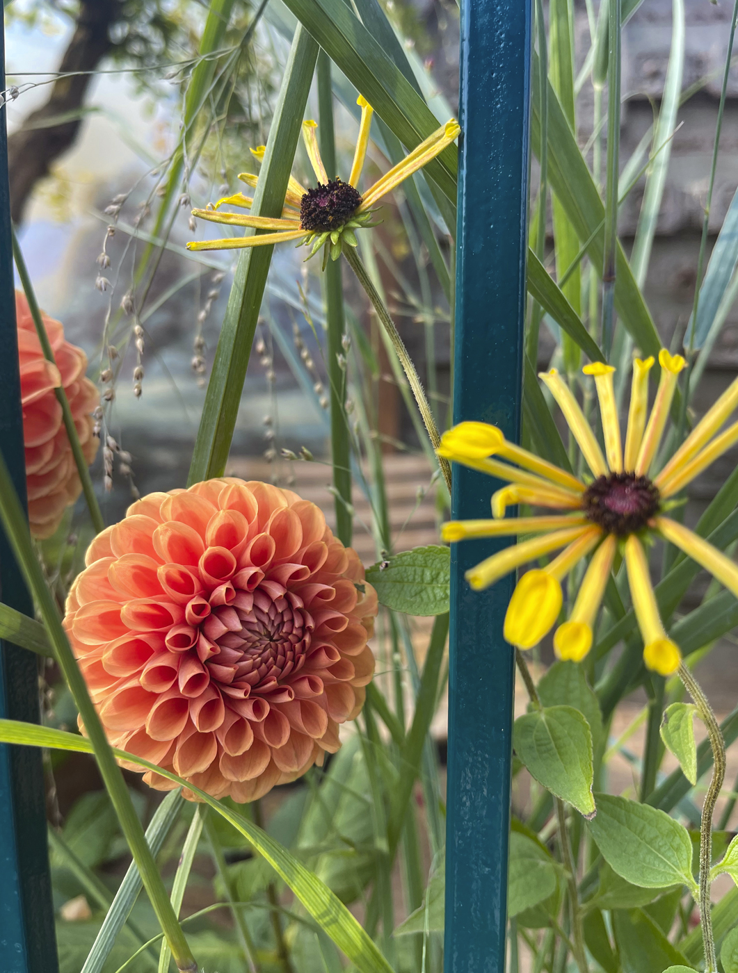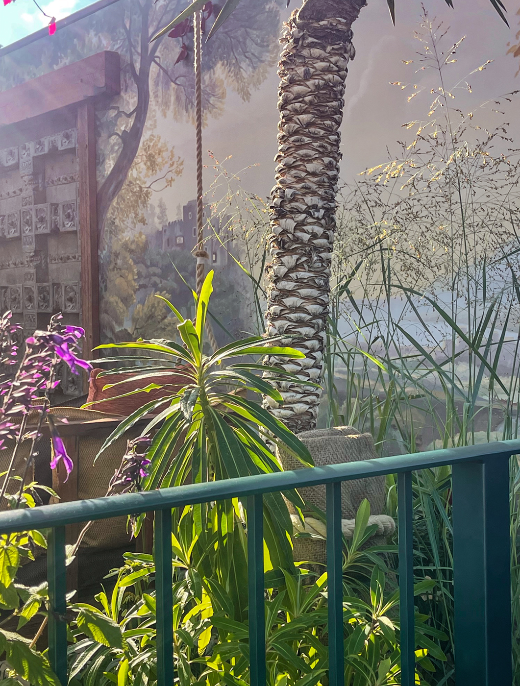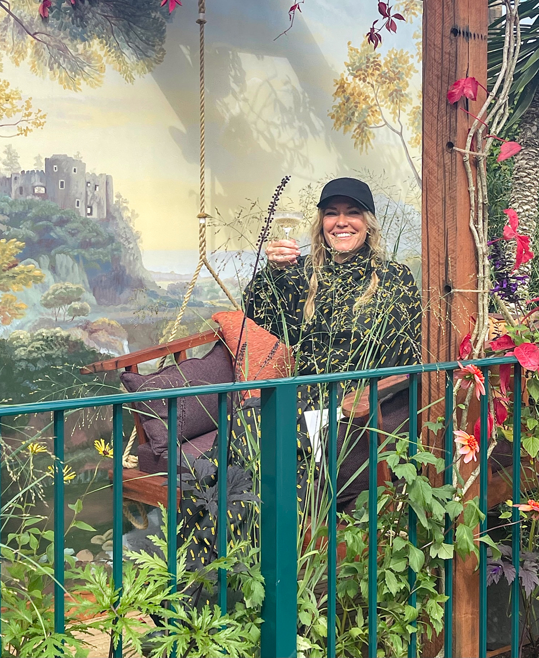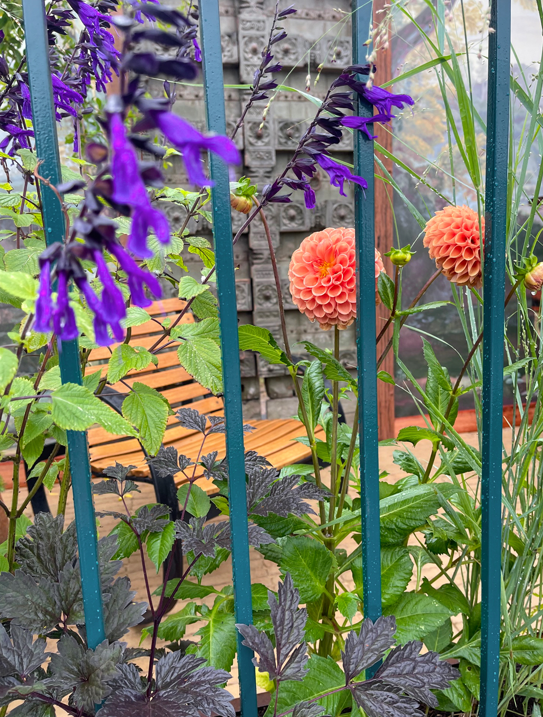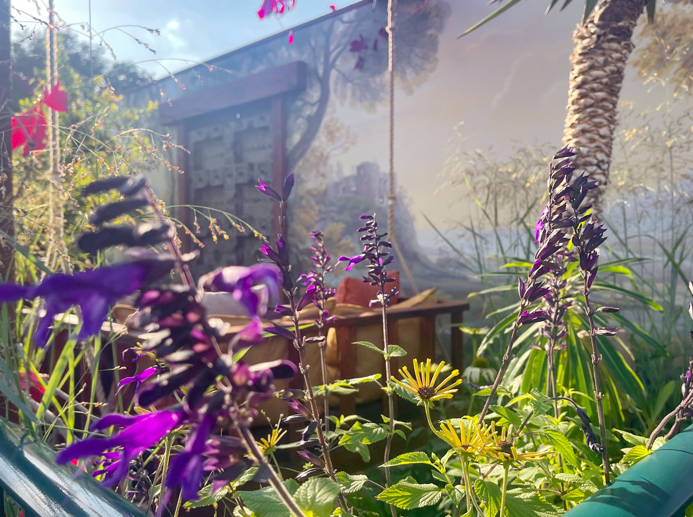 Martha Krempel’s ‘Arcadia’ was a knockout. The centrepiece – some old Indian doors – sets the scene. An antique-dealer client acquired a container of old Indian doors that had been lying around for 20 years; Martha loved them and used them to replace the RHS standard-issue ones. The pergola over the swing seat is covered with the bright red leaves of Parthenocissus quinquefolia; it is trained by strings threaded through carefully drilled holes in the timber. The painted backdrop on the “building” walls was subtle but helped transform the space. Autumnal colours are taken on to the cushions as well as in the planting. The abundance of foliage, thought and creativity of these five spaces will no doubt influence many balcony owners to revamp theirs.