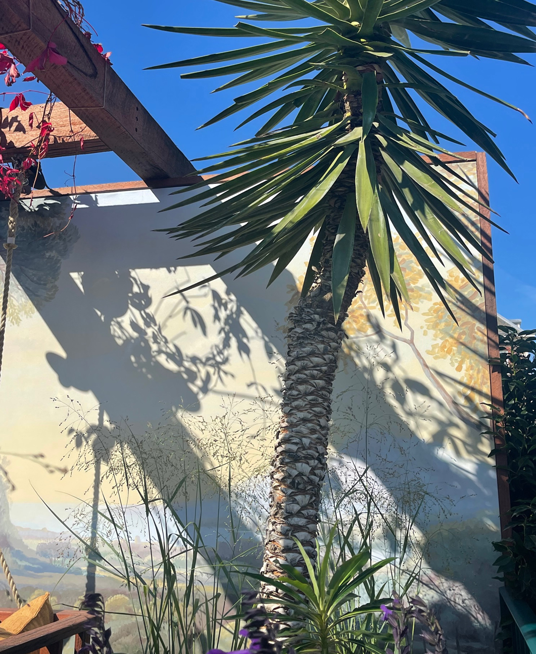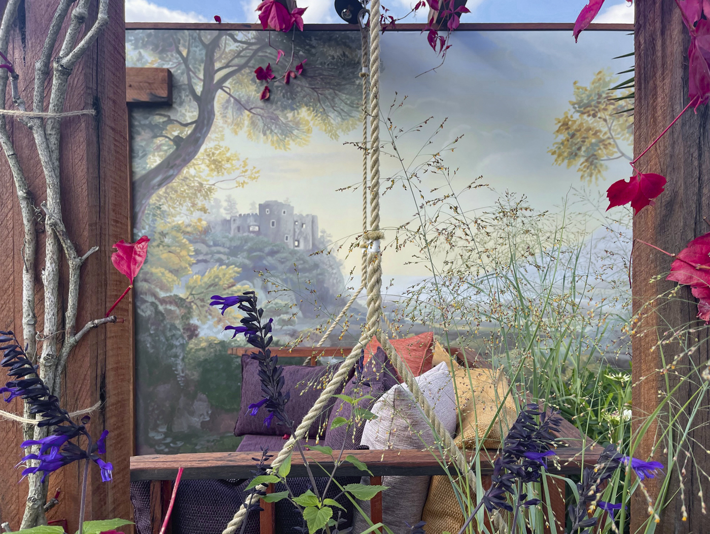 Arcadia is about escape with the painted backdrop giving the illusion of more space. The trees act as sentinels providing a sense of enclosure and have their own eco system, they herald in a touch of the exotic. Reclaimed Jarrah timber has been reworked into the swing seat and provides the perfect spot to watch the insects collecting nectar on the late flowering perennials. The planting and fabrics are rich in tone chosen to celebrate the drama of Autumn.