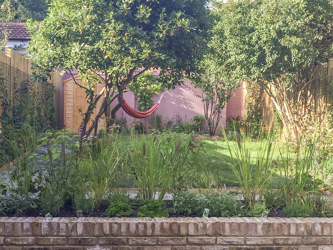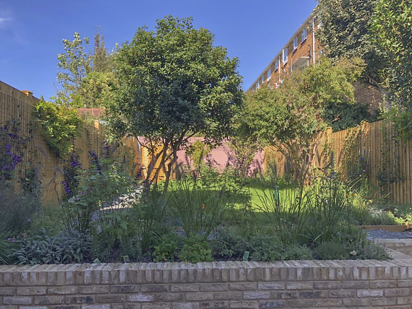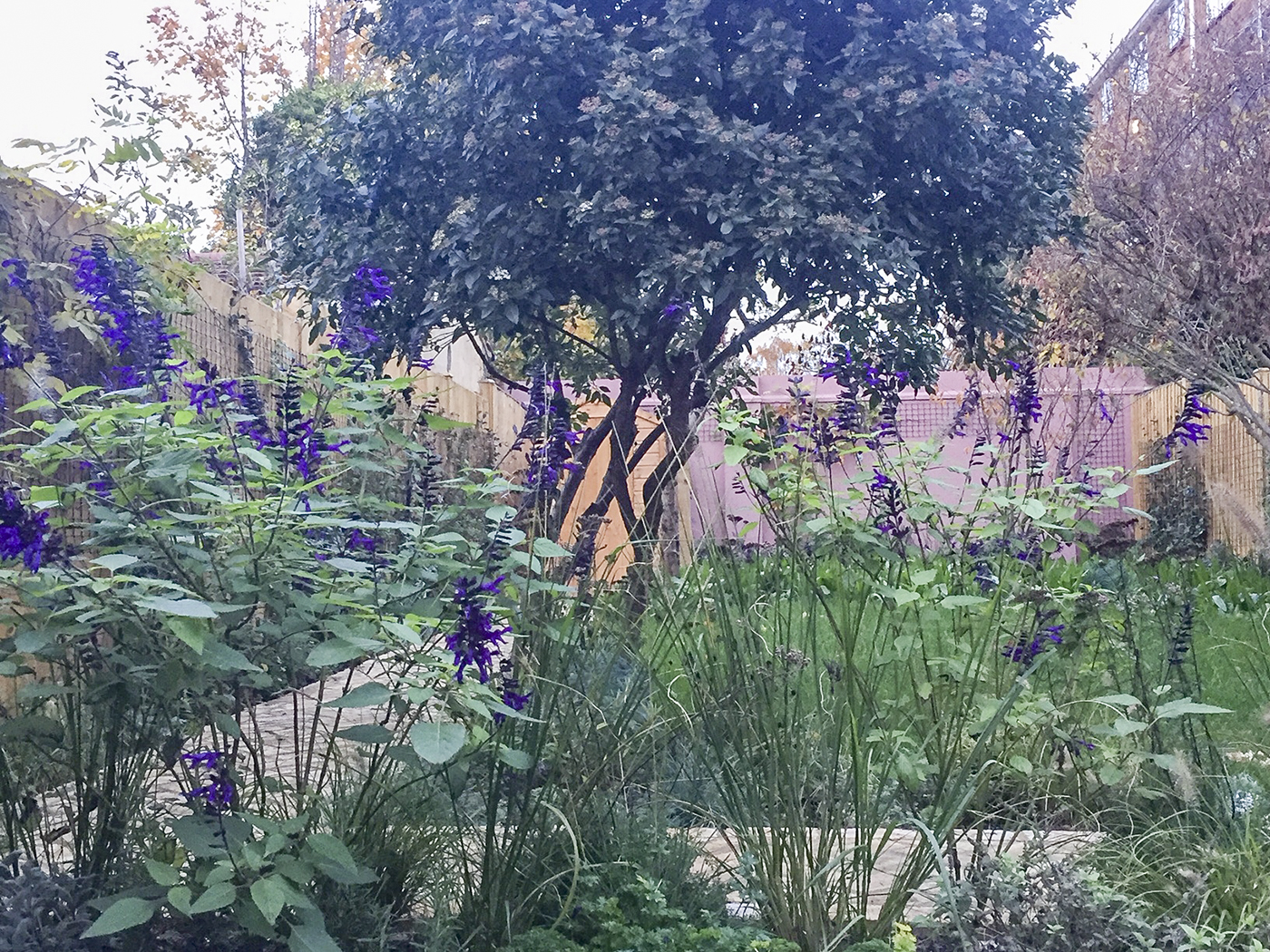 A garden in the city filled with flowering perennials, Salvias, Rudbeckias Achillea, Anemone, Roses Clematis, flowering meadow and a lawned area. Structural trees provide shade for the family.