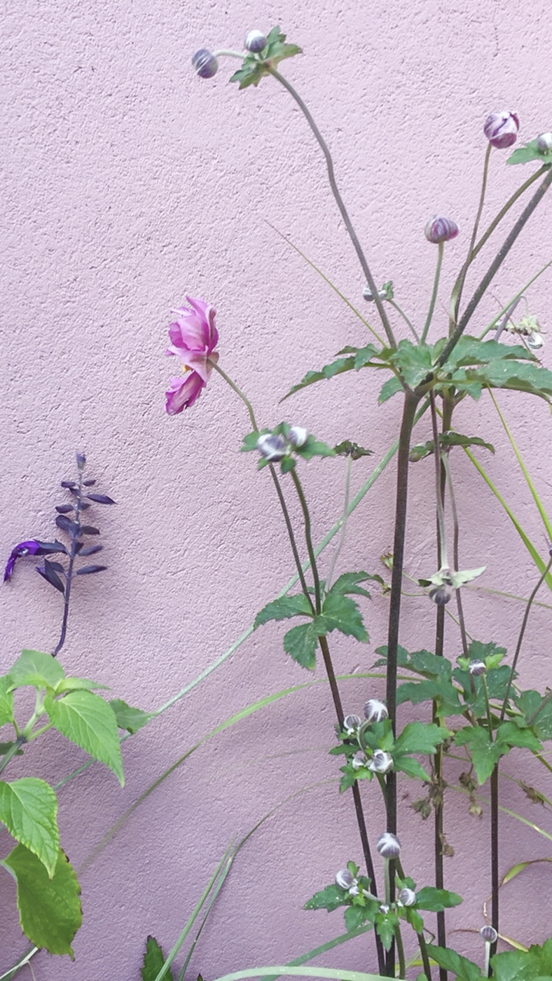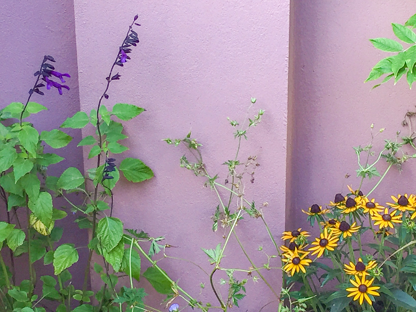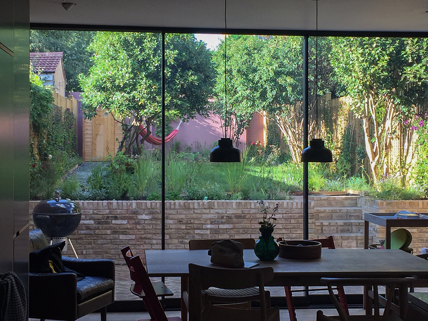 A garden in the city filled with flowering perennials, Salvias, Rudbeckias Achillea, Anemone, Roses Clematis, flowering meadow and a lawned area. Structural trees provide shade for the family.