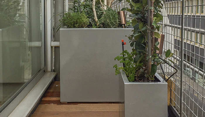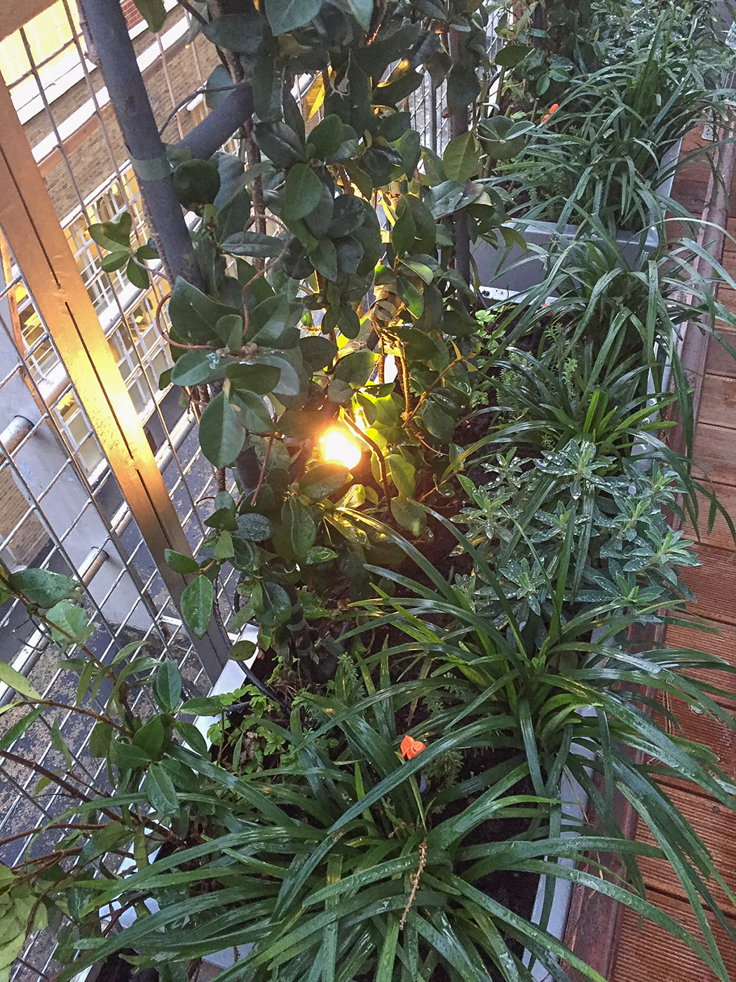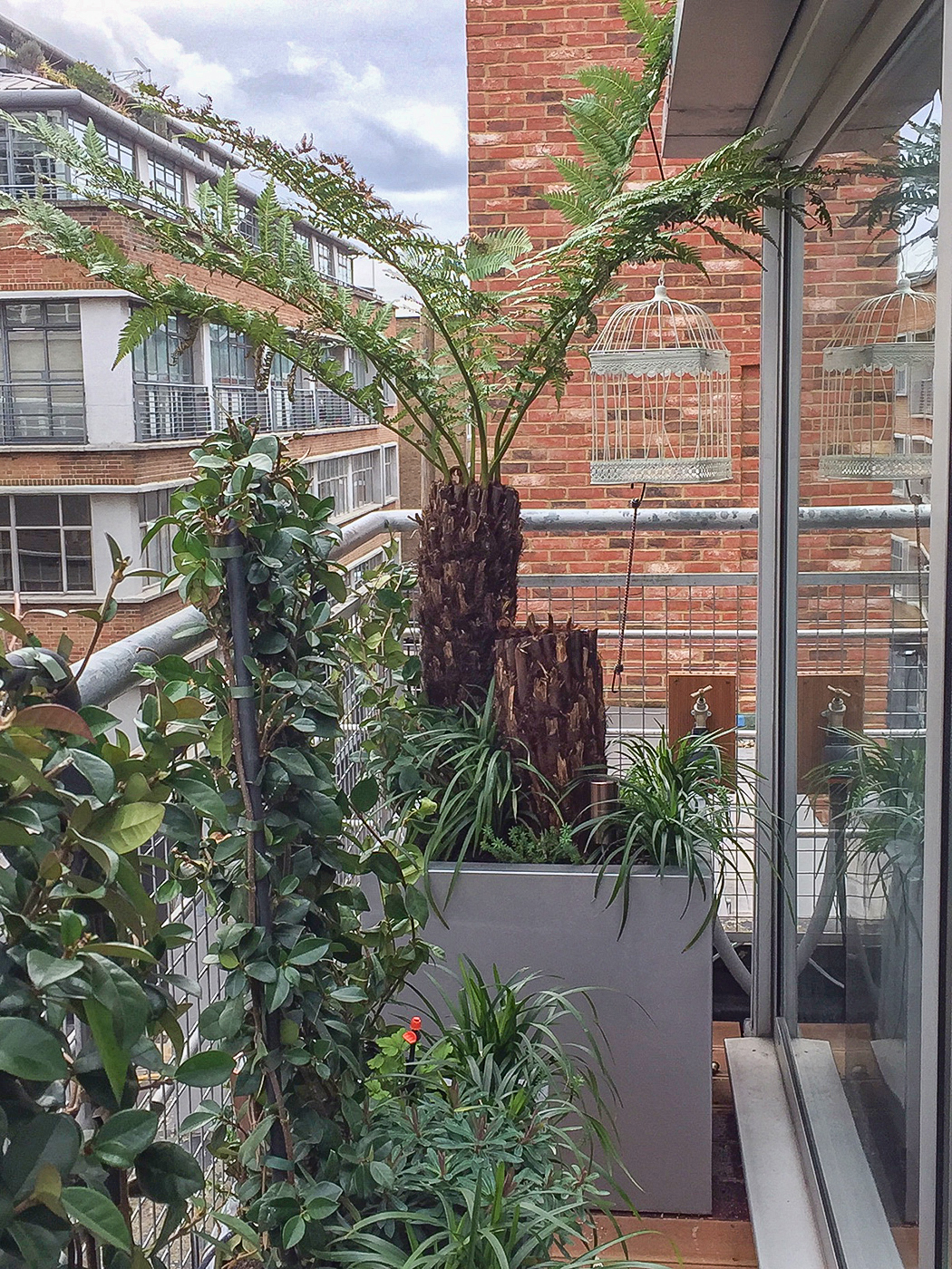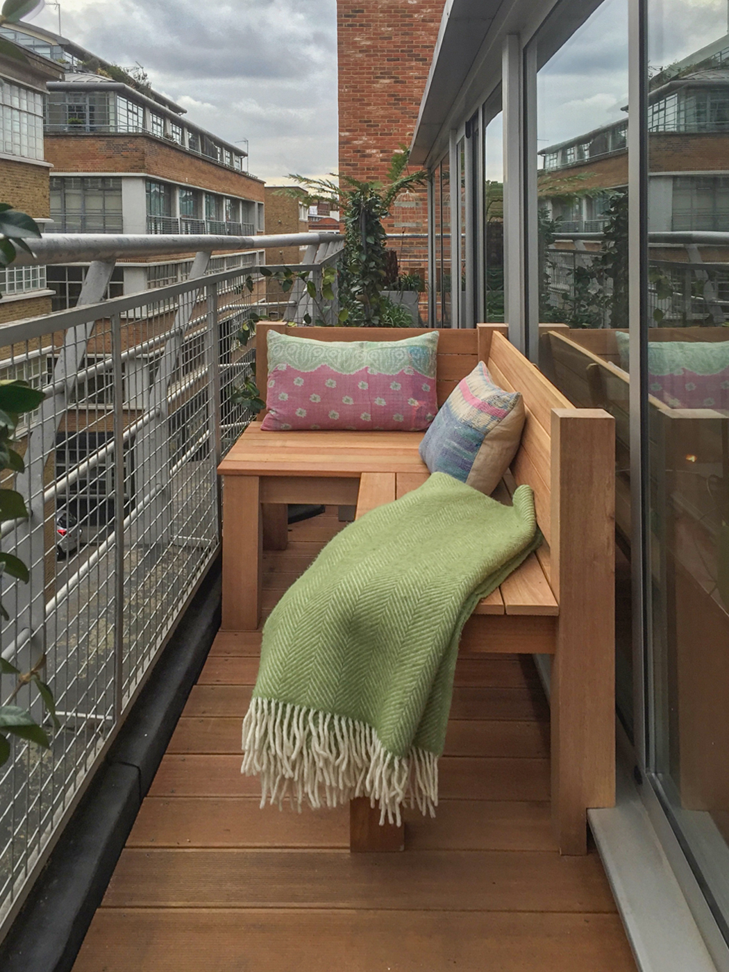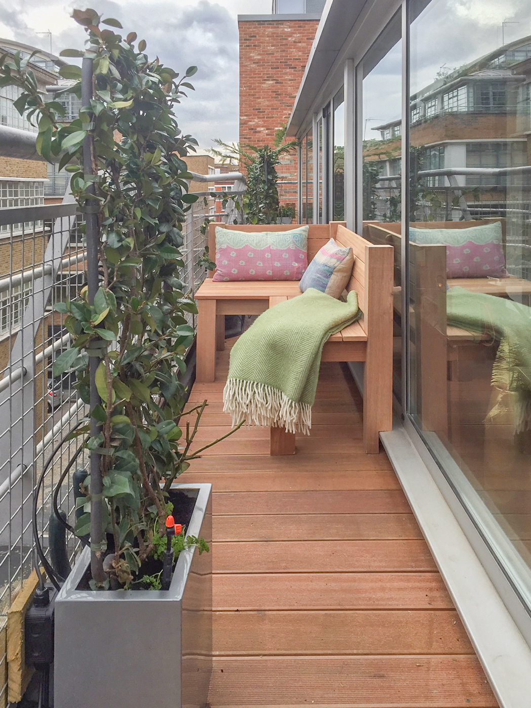This is the skinniest garden done to date on a wrap around balcony in Clerkenwell. Ocean Liner in theme, the area is decked with dark boards, custom made steel coloured planters and a hardwood bespoke bench.