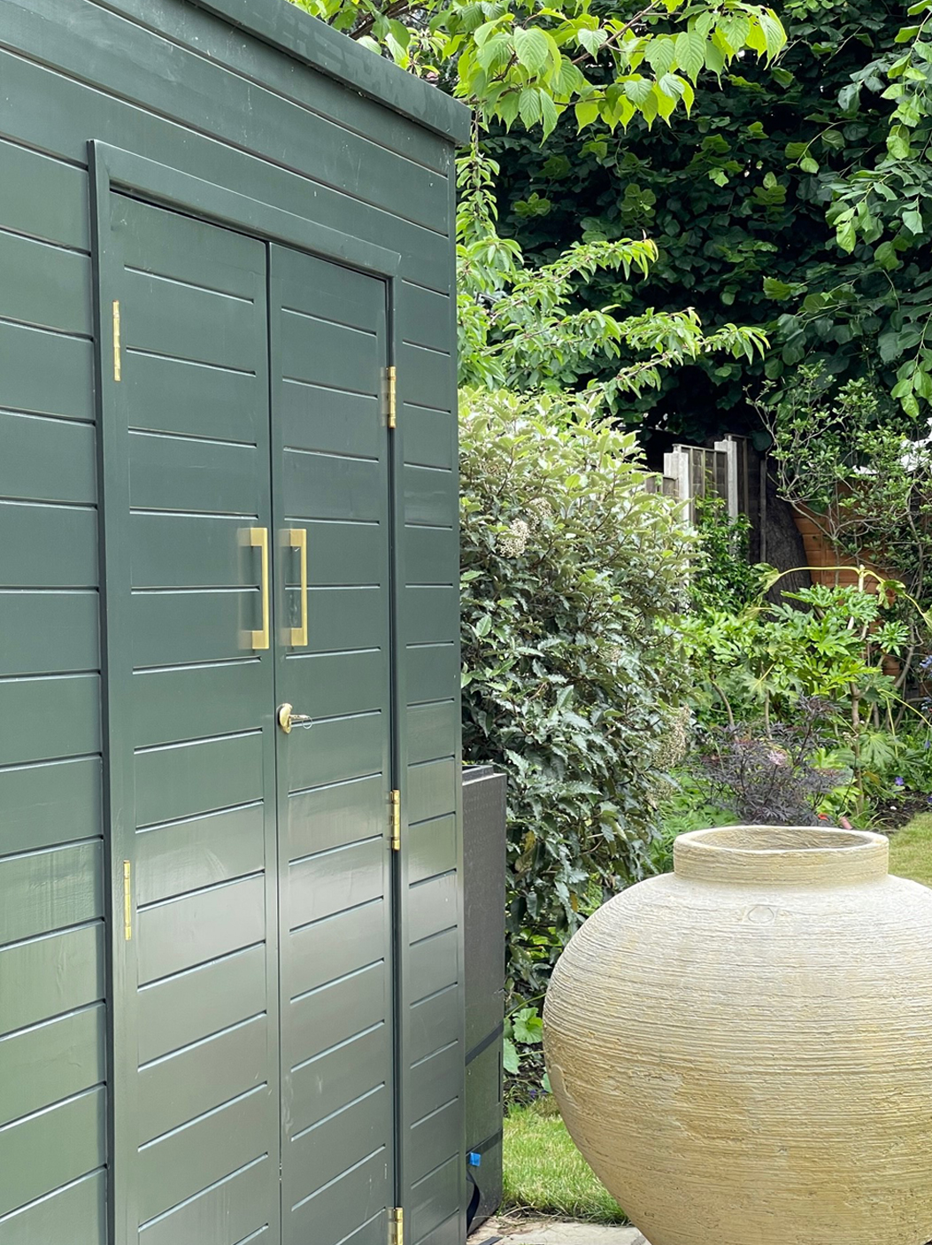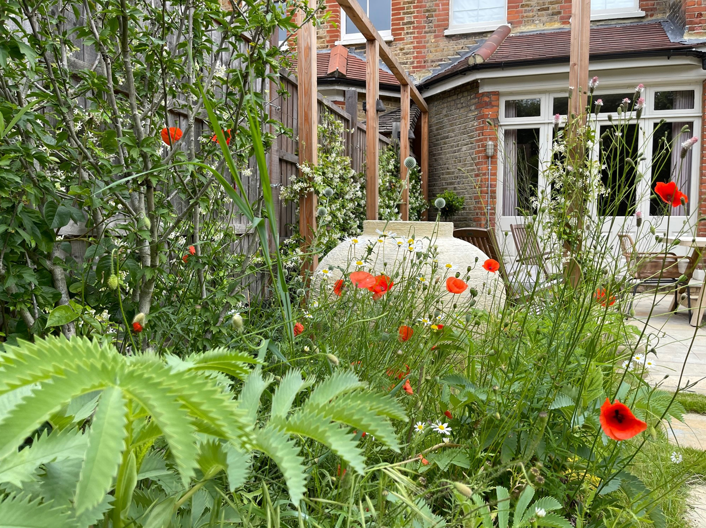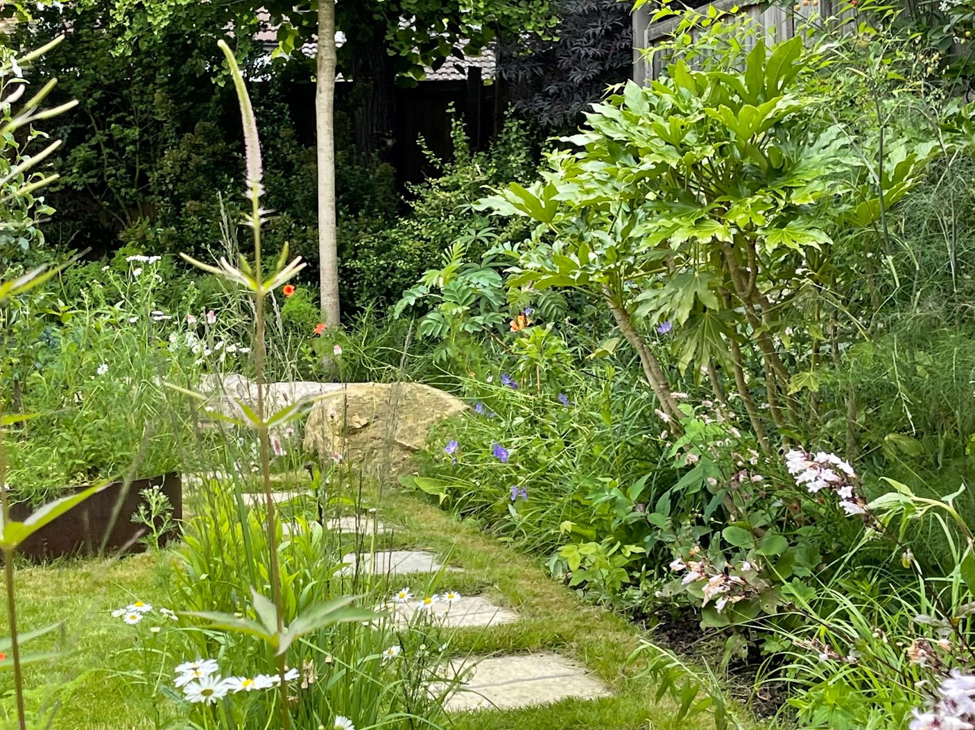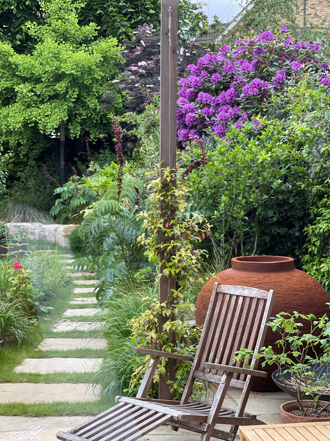 A large lawned family garden in West London with sunken trampoline, a natural boulder wall and large entertainment terrace. The garden is maturing beautifully, the trees planted at the outset form the backbone and structure of the garden and the seasonal planting brings the composition together.