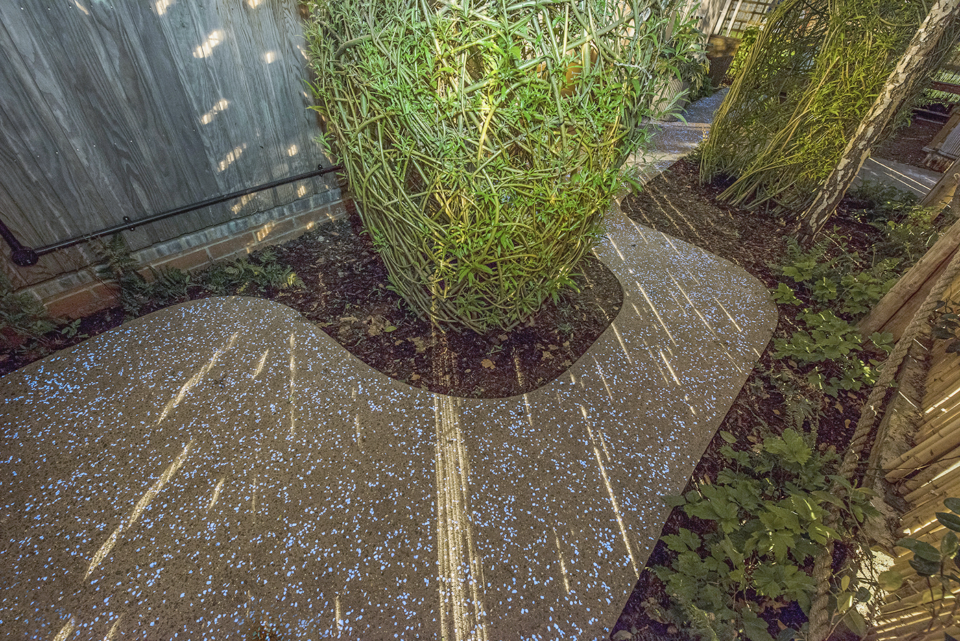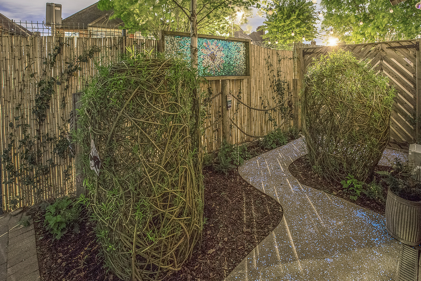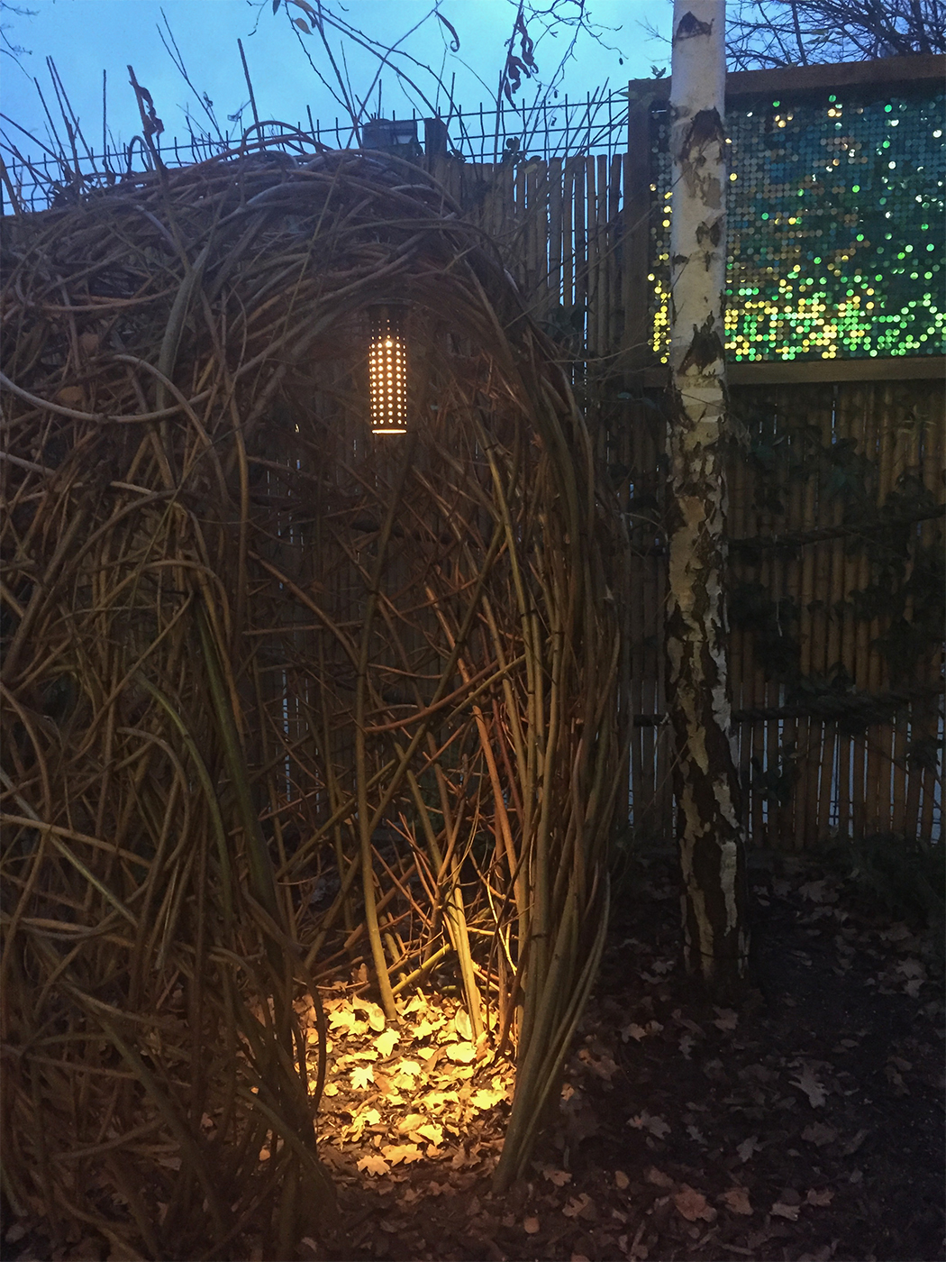It is a multi disciplinary approach to garden design in a small area, the Collaboration with Willow Artist Jim Buchanon, use of Art and commercial imagery in the shimmer image, diverse technology with light emitting aggregate set within the pathway all make for a stimulating environment for pre-school children.