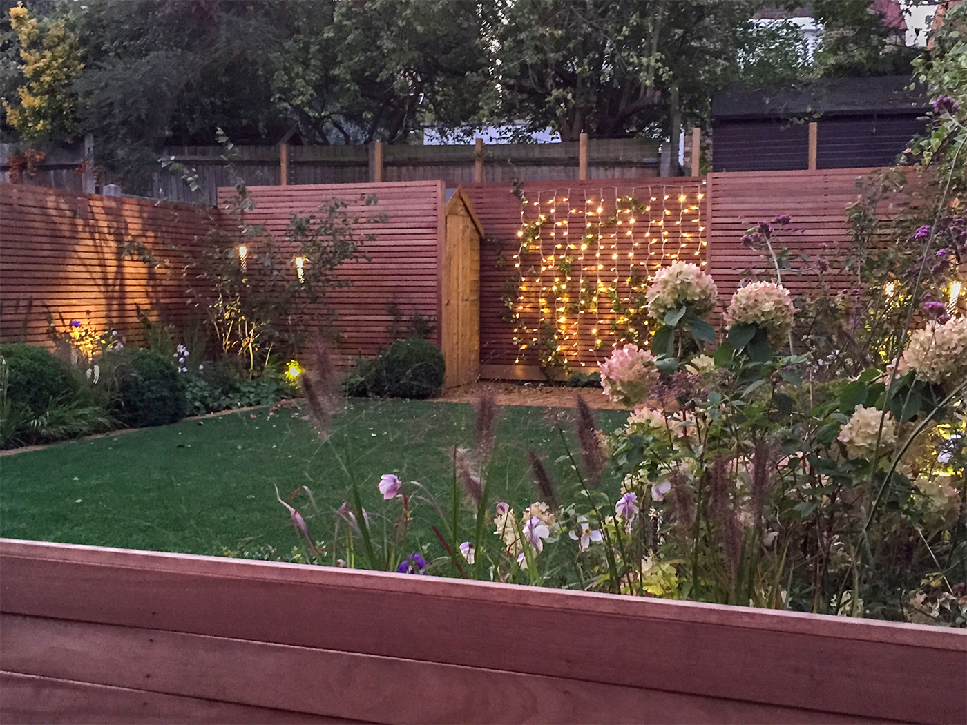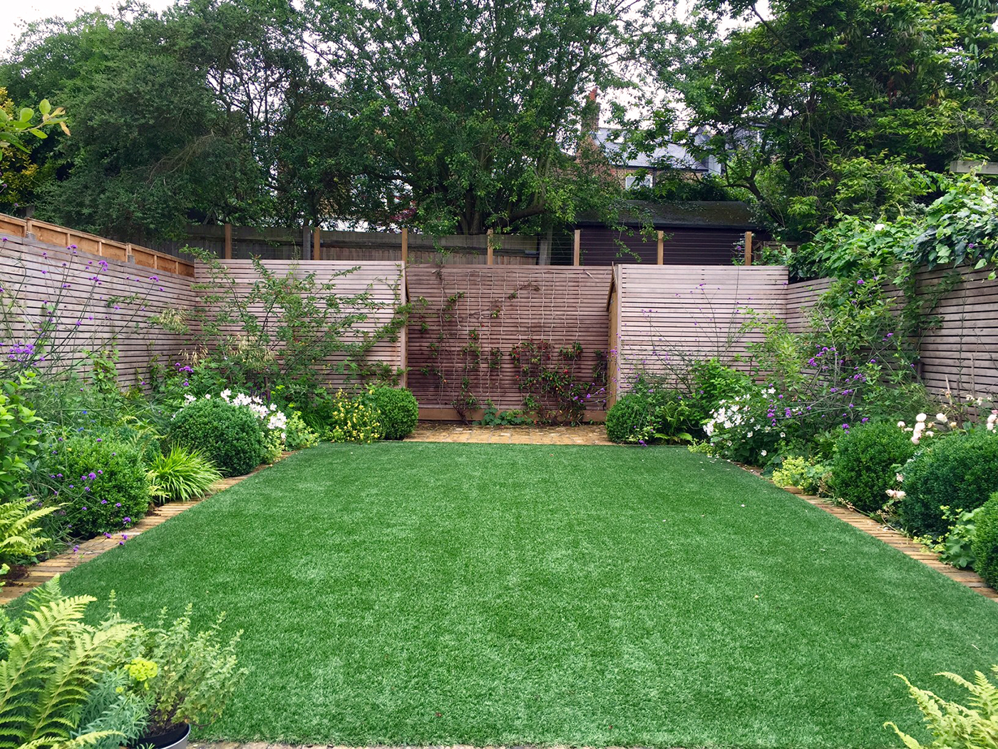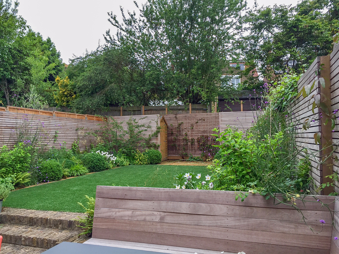 A family garden with winter structure and many flowering perennials keeping to the clients colour scheme of purple, white and fresh green. The garden has symmetrical timber storage sheds concealed behind custom made hardwood trellis and flowering climbers. For this project I designed a hardwood dining bench to sit on the terrace.
