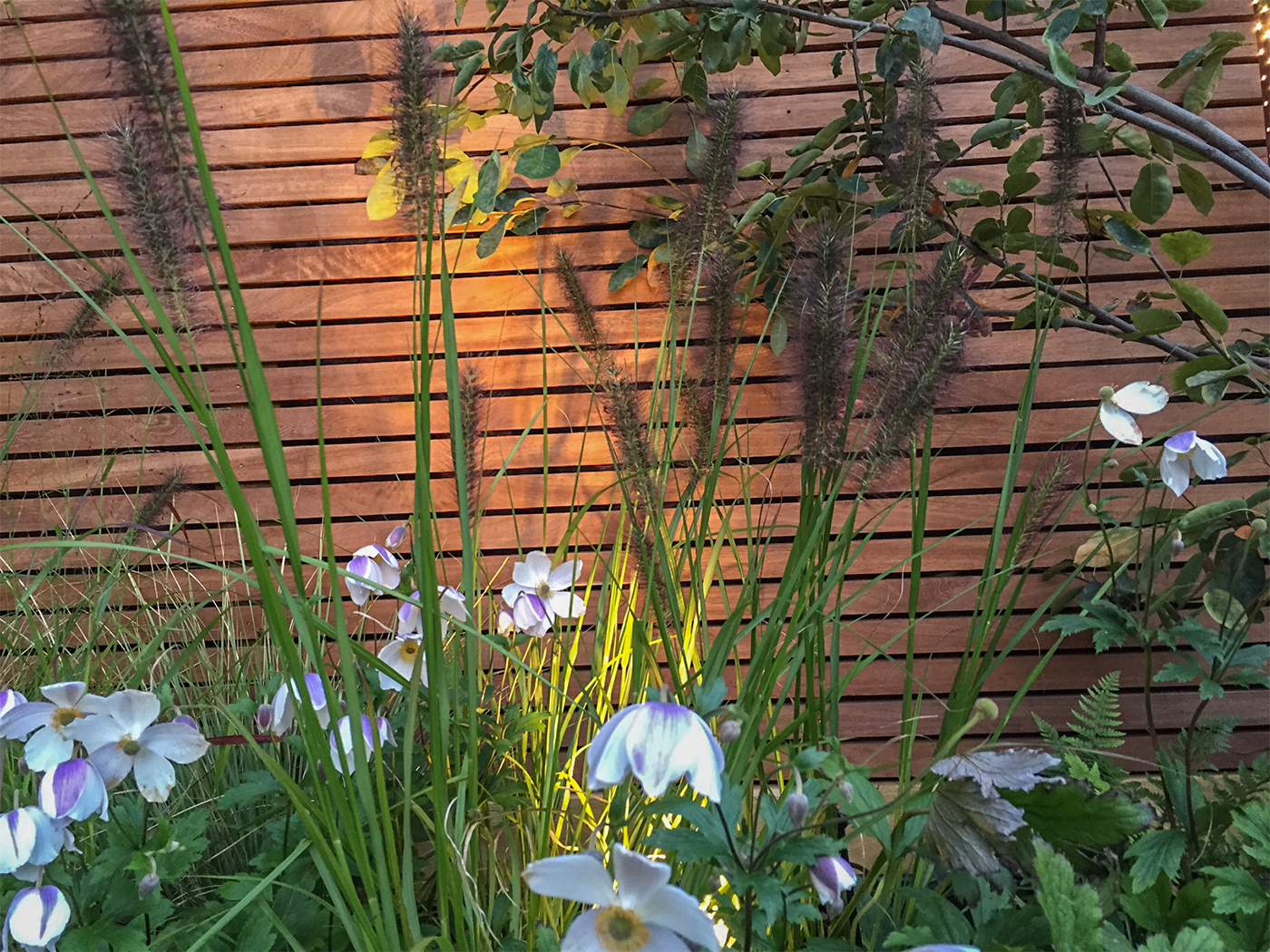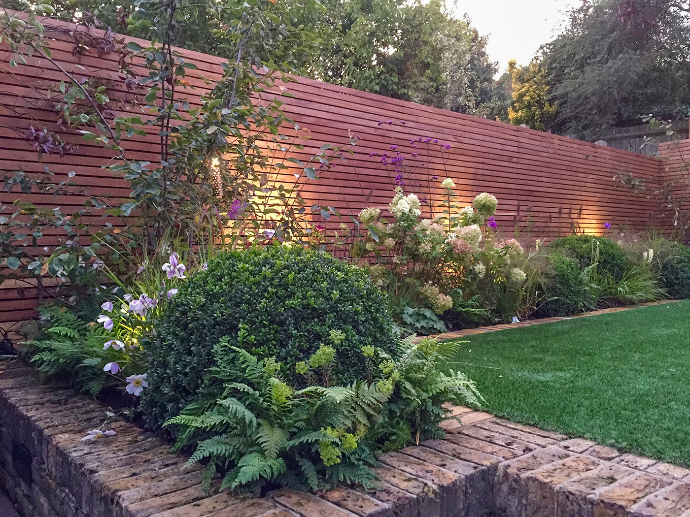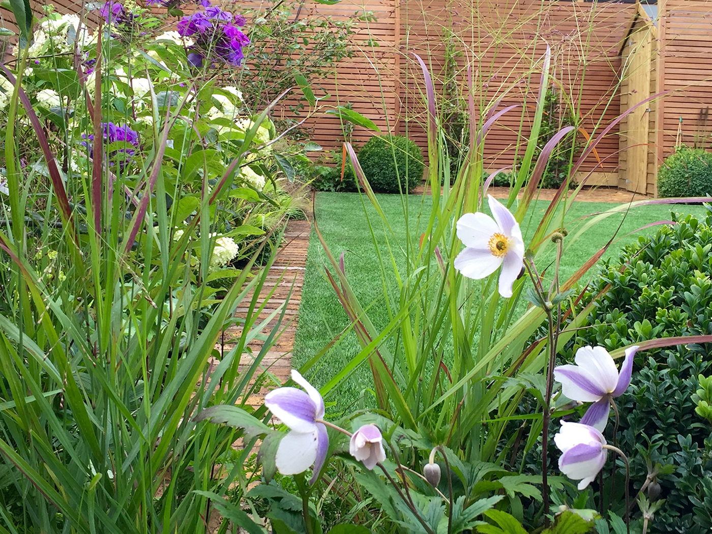 A family garden with winter structure and many flowering perennials keeping to the clients colour scheme of purple, white and fresh green. The garden has symmetrical timber storage sheds concealed behind custom made hardwood trellis and flowering climbers. For this project I designed a hardwood dining bench to sit on the terrace.