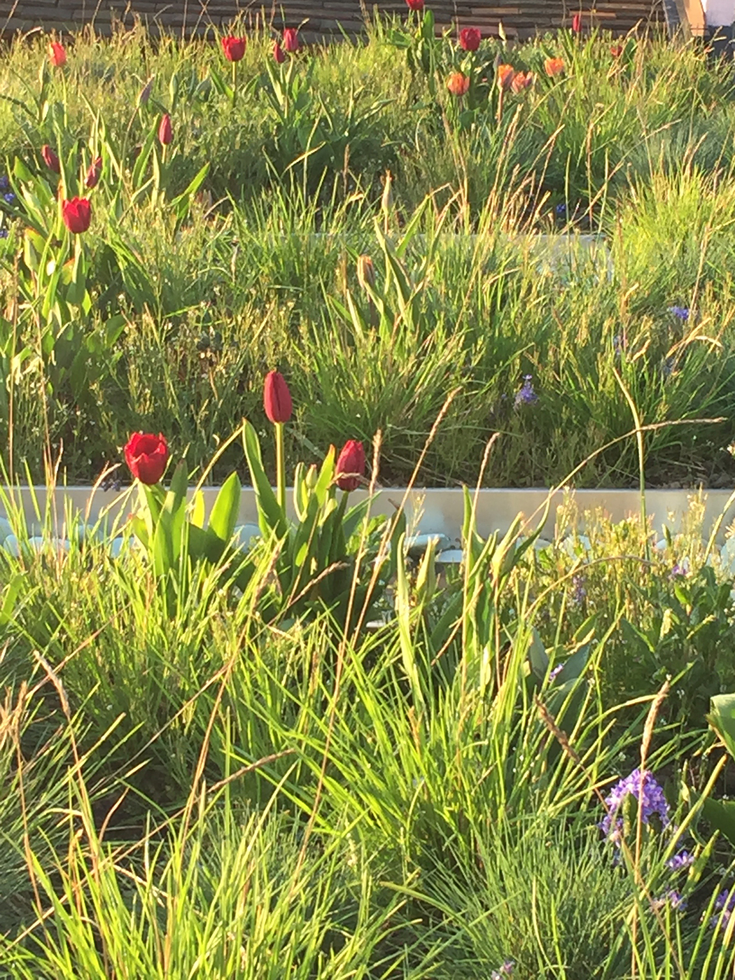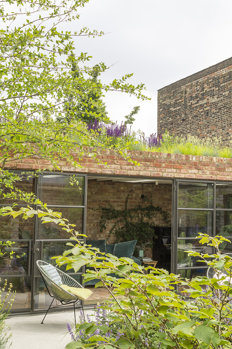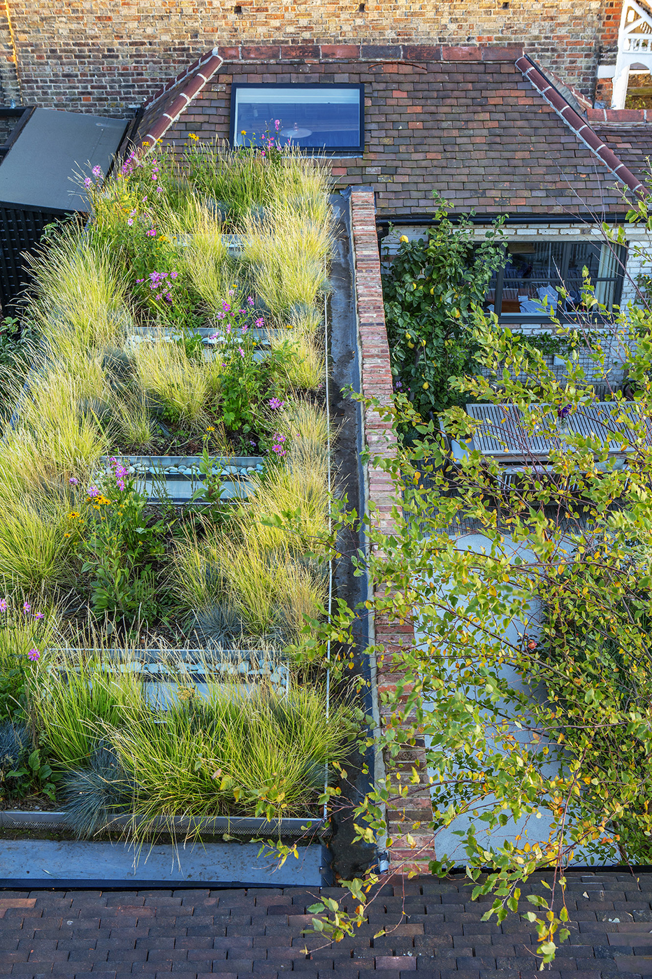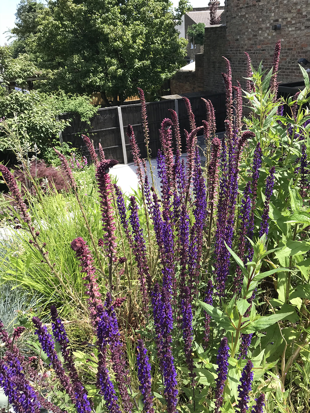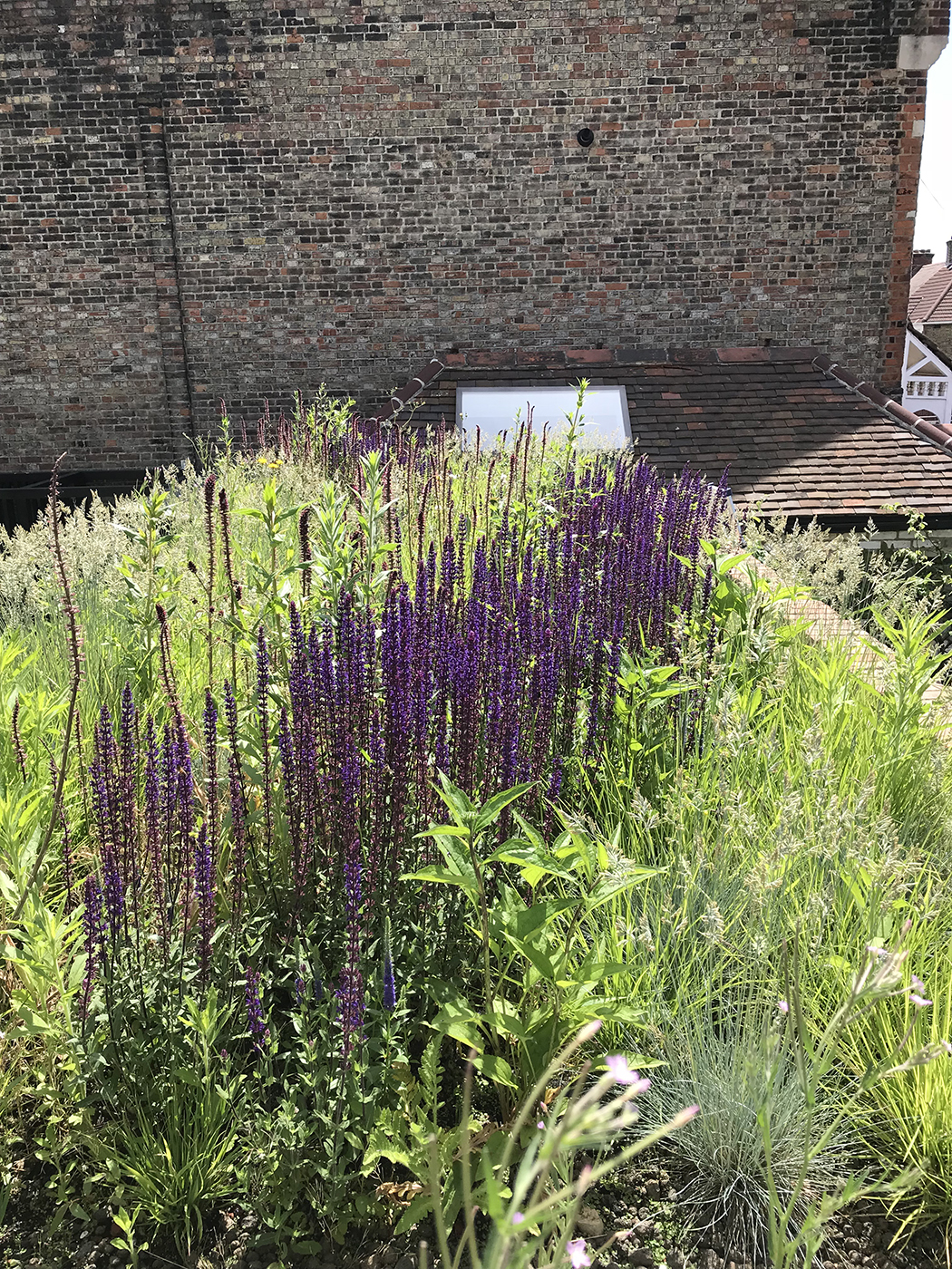 It works on many different levels. It absorbs rainwater and slows down water entering our overflowing London drains, it creates a natural habitat for invertebrates, it is an opportunity to grow sun loving plants as it has no shade.