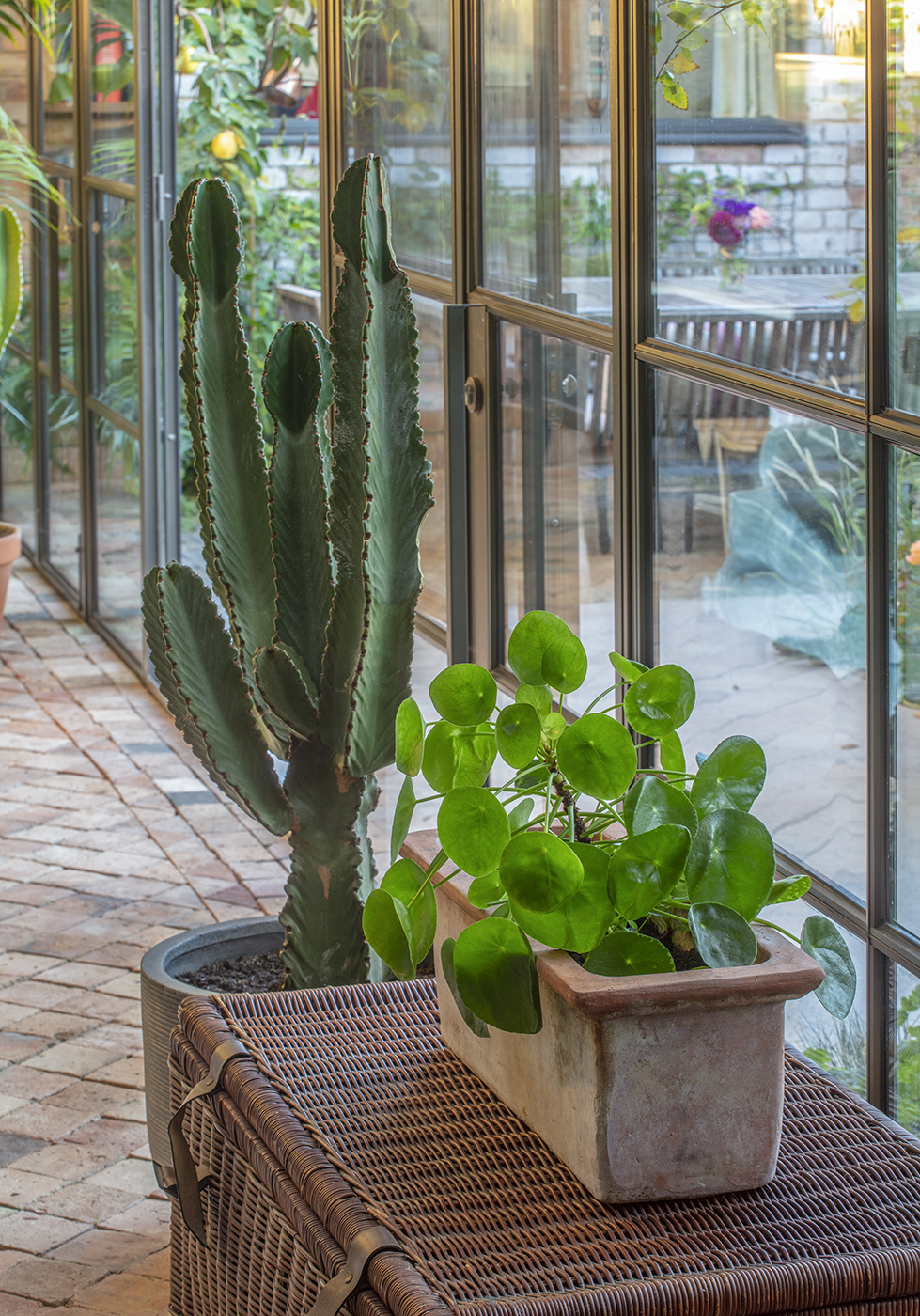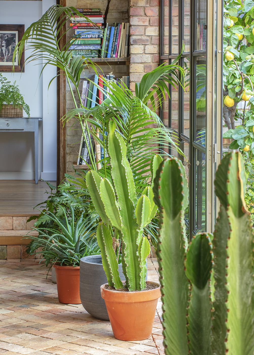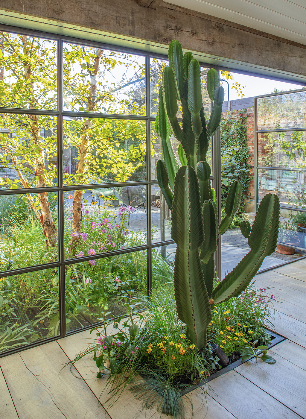 Lush and green, a place to sit inside enveloped by tropical plants while looking out onto the outdoor space, blurring the boundaries between inside and out. The planting starts inside the house with a mature cactus in a bed of grasses, with pink and yellow flowers blooming.