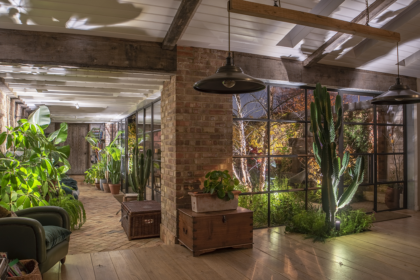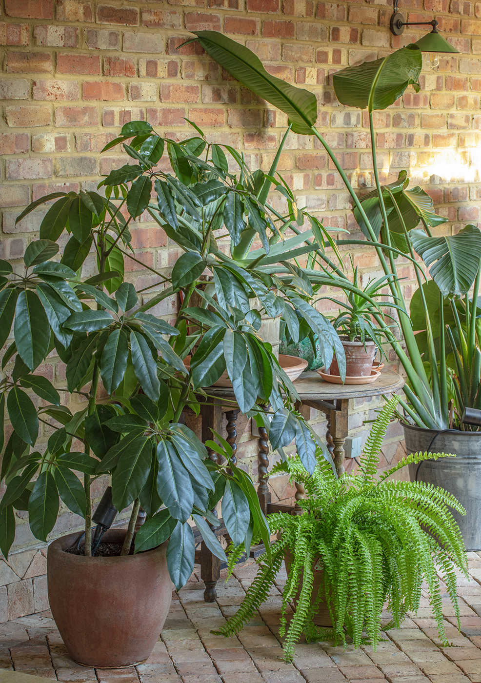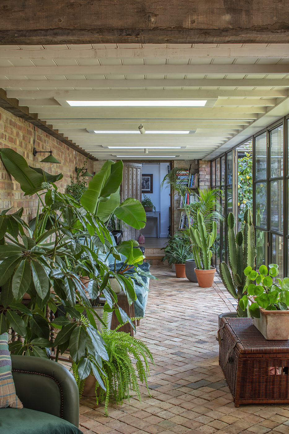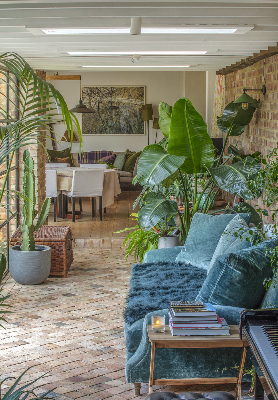 Lush and green, a place to sit inside enveloped by tropical plants while looking out onto the outdoor space, blurring the boundaries between inside and out. The planting starts inside the house with a mature cactus in a bed of grasses, with pink and yellow flowers blooming.