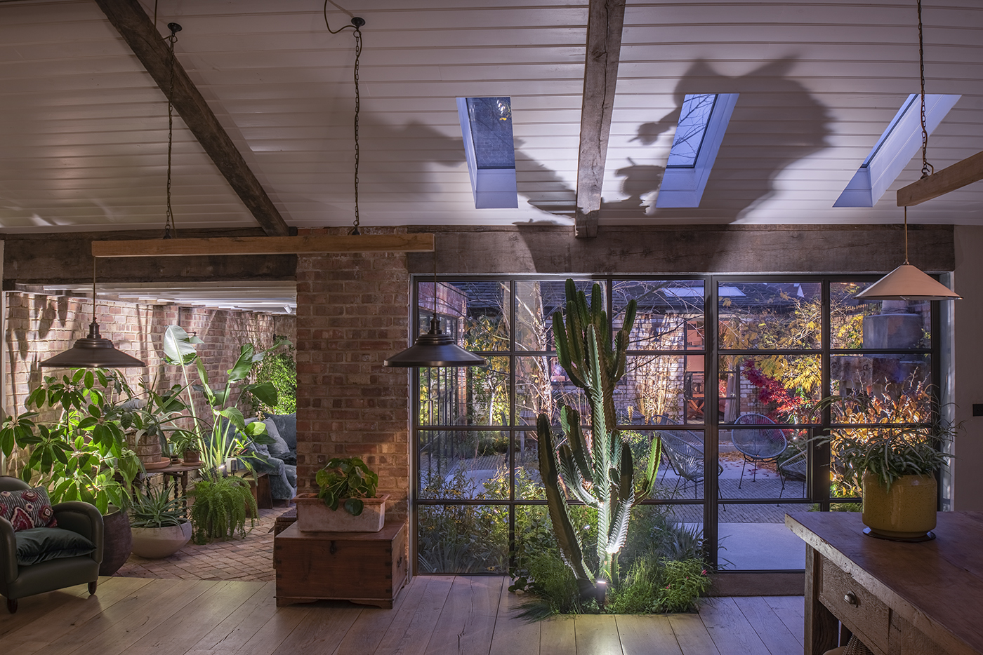 The outdoor garden mirrors this planting style seen beyond the glass pane connecting and fusing indoors with outdoors.