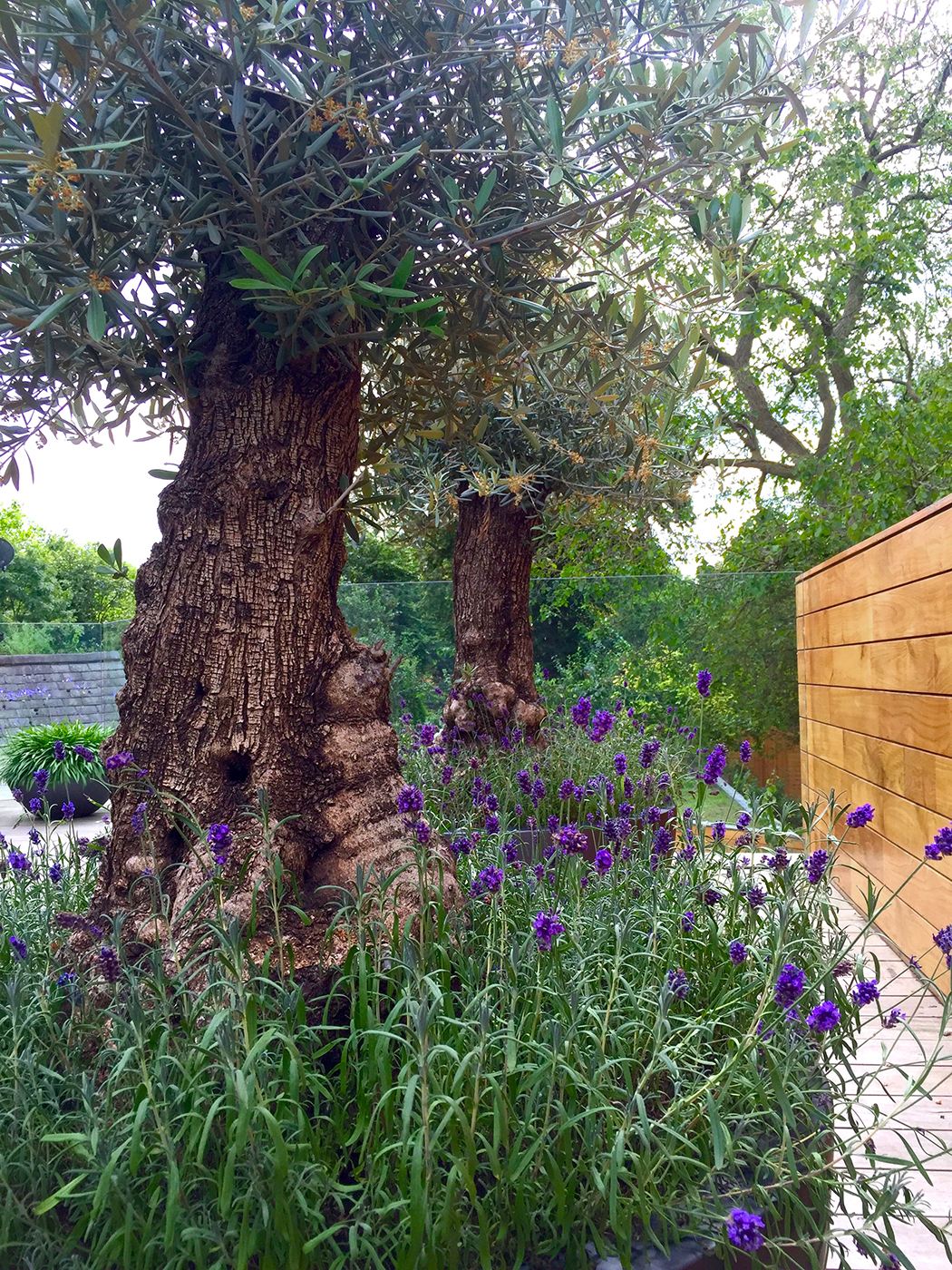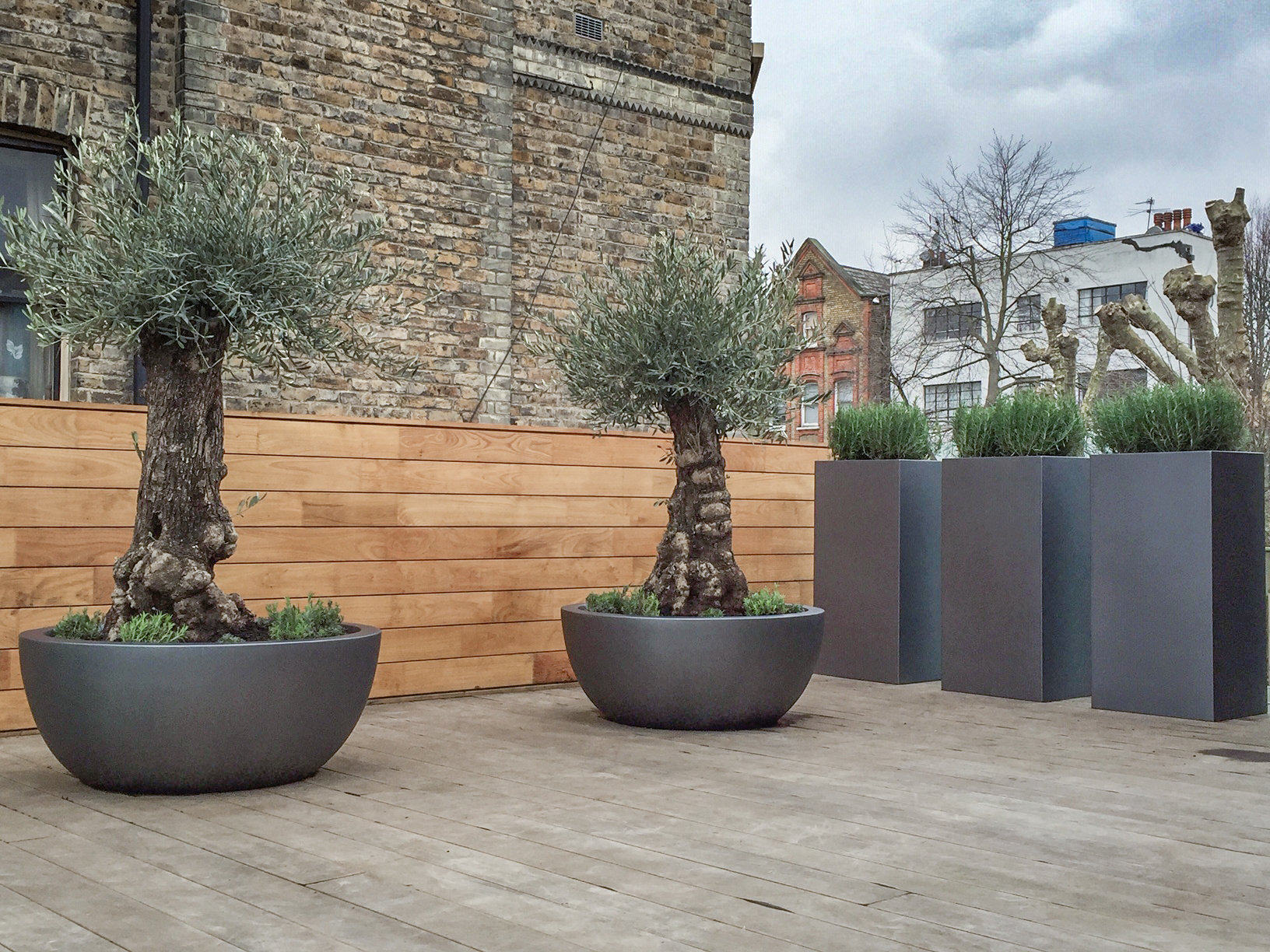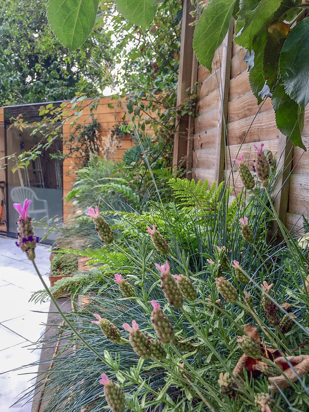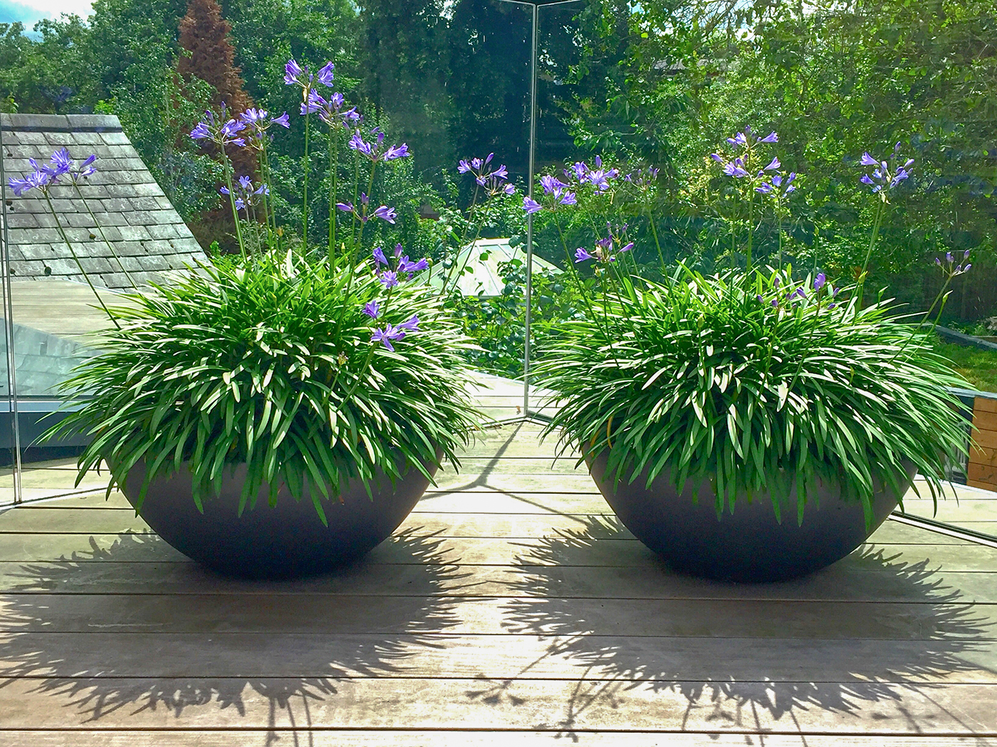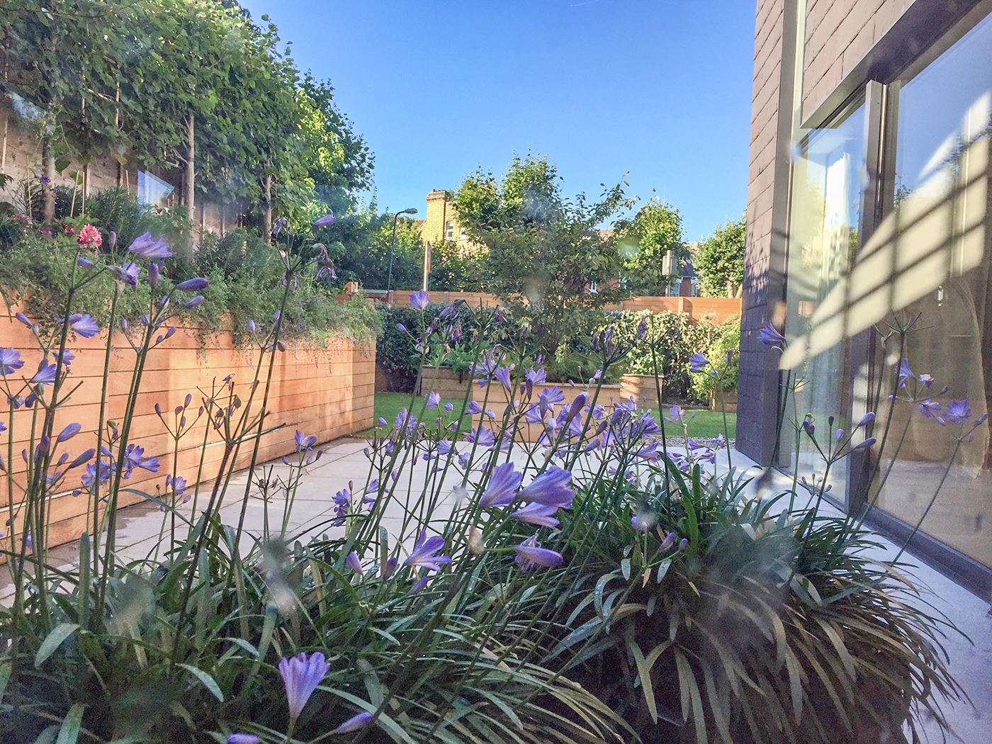 My clients gave a great brief and we worked together, incorporating favourite plant choices into the design. The garden has four distinct planting areas: Master bedroom roof terrace with south facing aspect, where Mediterranean plants grace the space, Olives, Rosemary and Agapanthus.