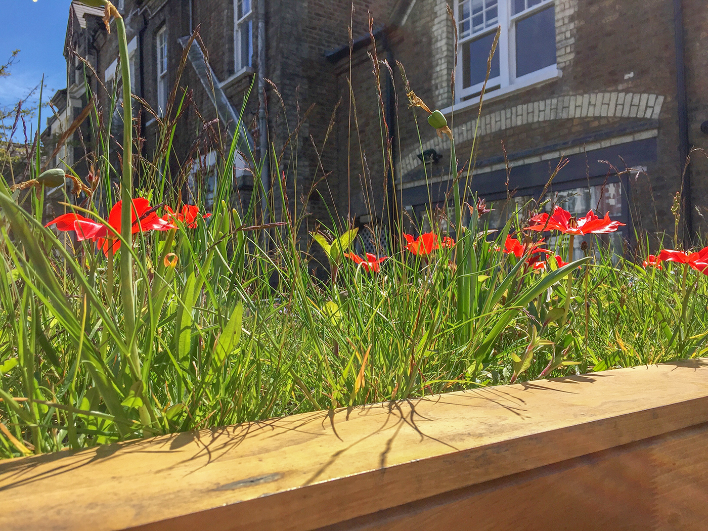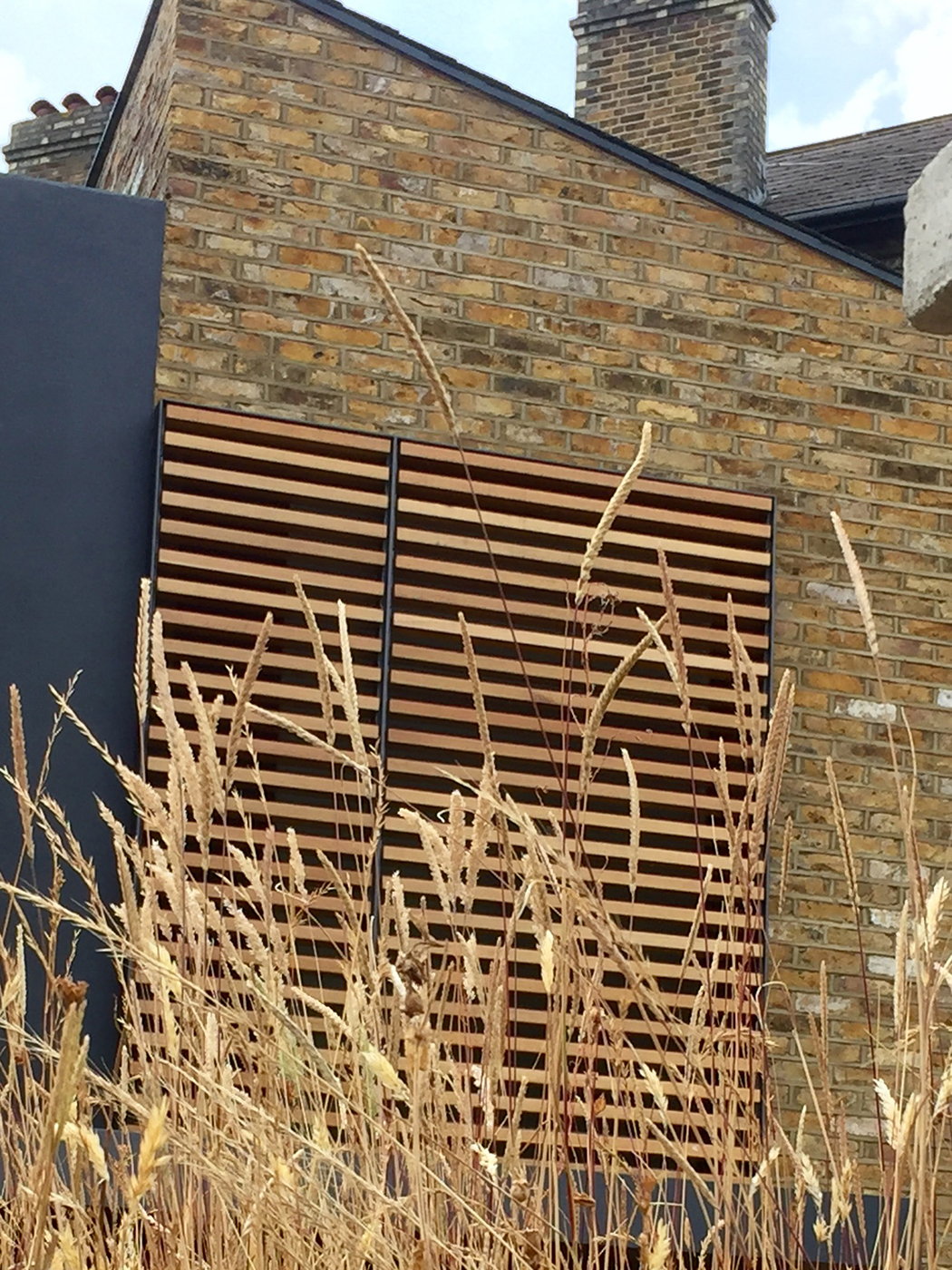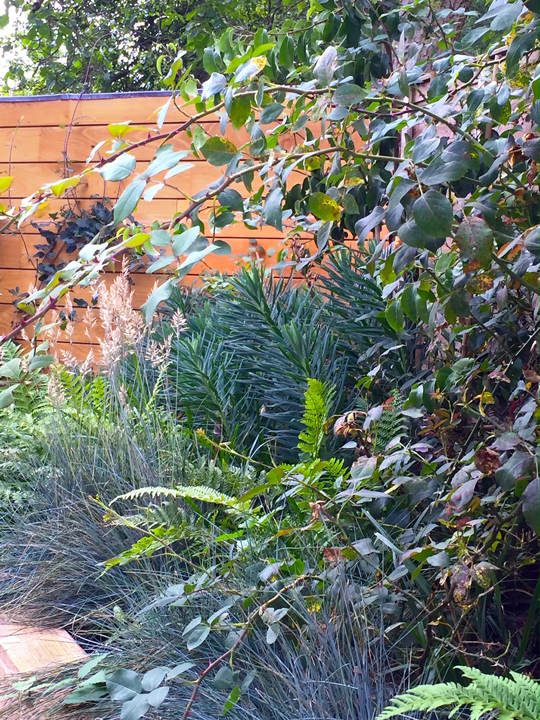 To mark the corner boundary of the property and to give structure and majesty to this front garden, a Liquidamber was planted where the evening sun will catch its' Autumn spectacle of rusts and fiery reds complimented by the underplanting of Achillea Terracotta and Knifophia ‘Tawny King’. The Autumnal foliage has the perfect backdrop in the original London stock brick wall which surrounds the garden.