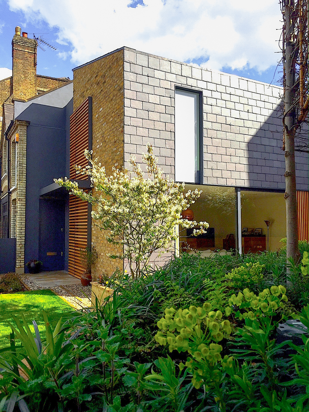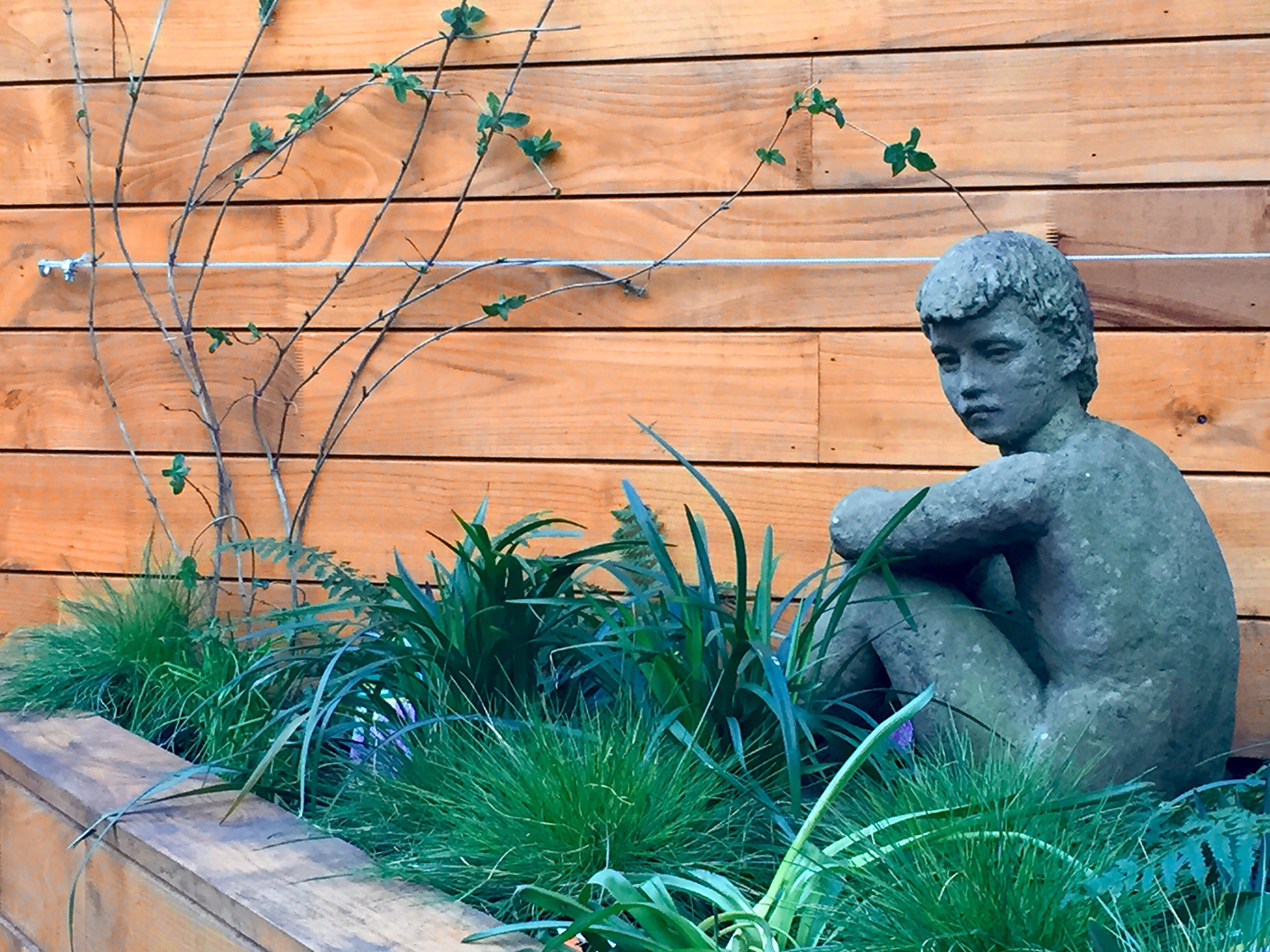The Rear Garden: Soft ferns and Festucas cushion the ground in the rear garden where a commemorative stone statue of a boy sits amongst the foliage. A backlit stained glass window from the original house is sited here against the boundary, bringing together the old and the new.
