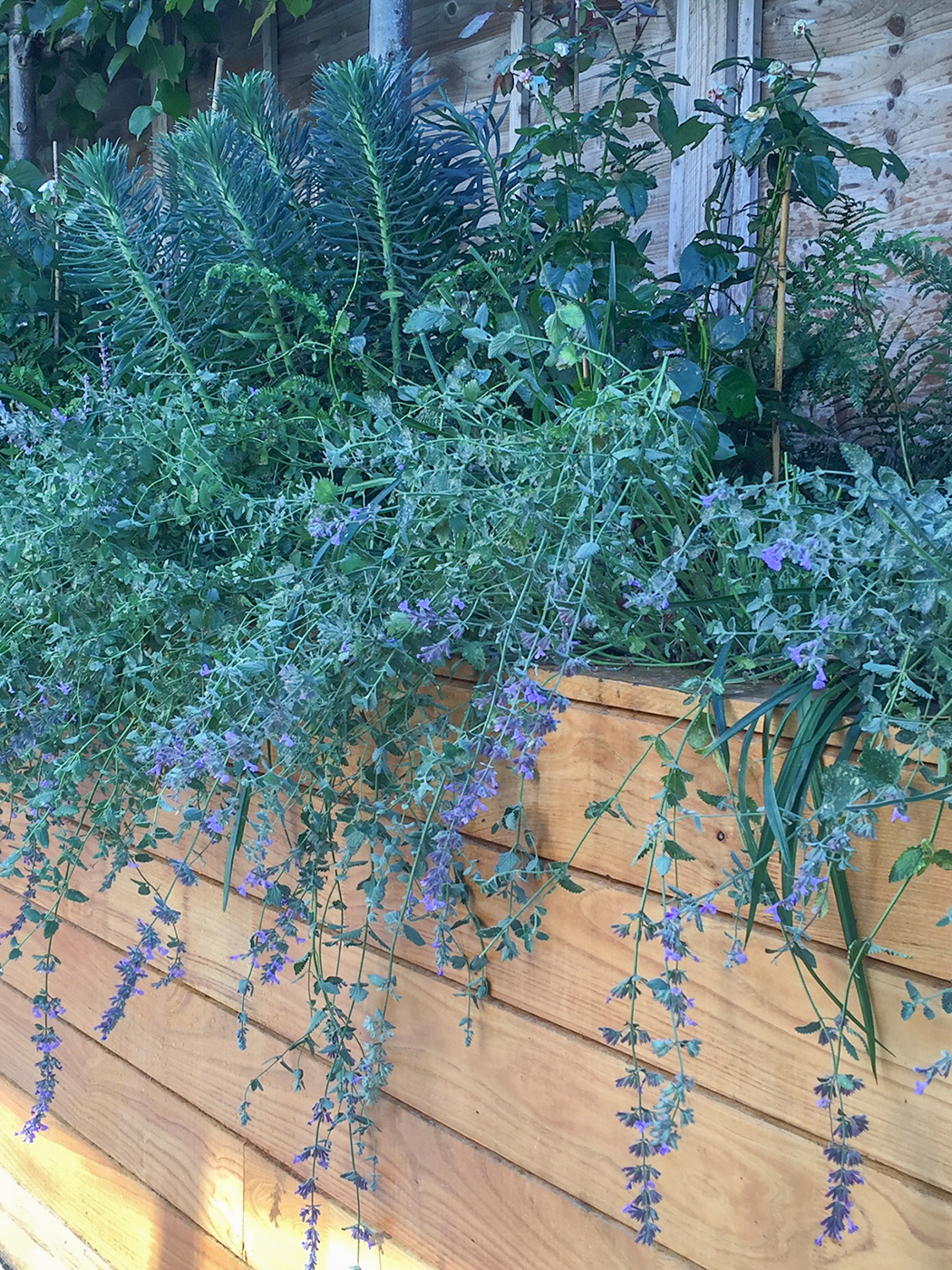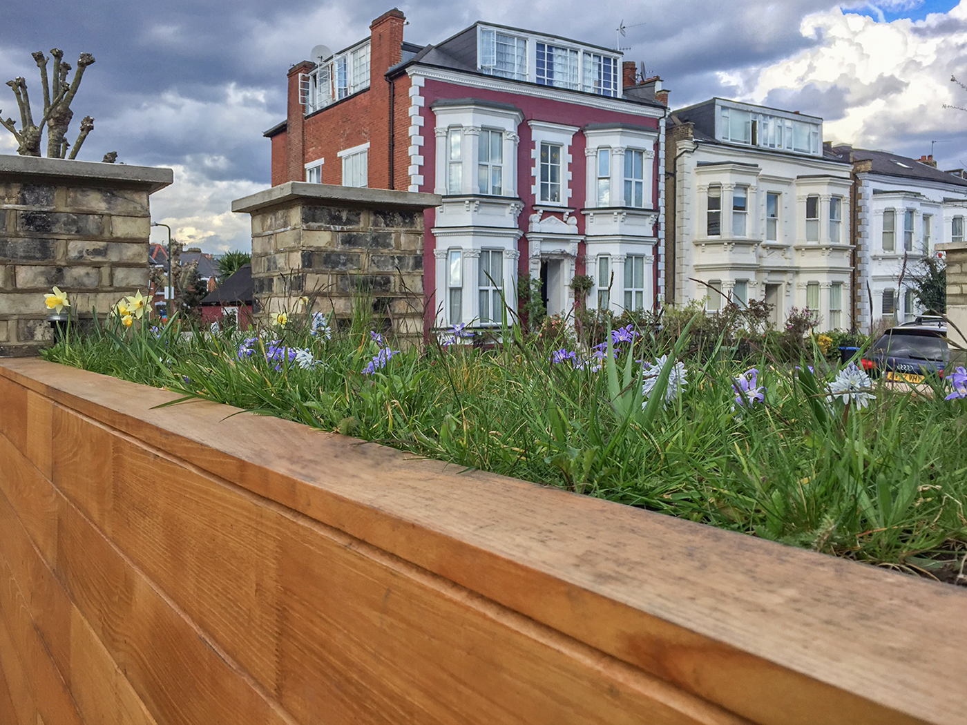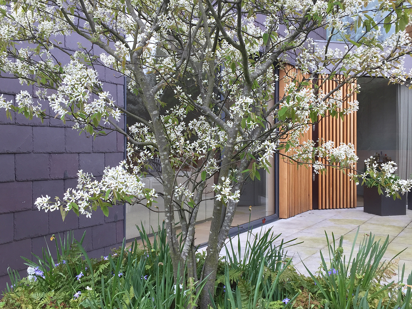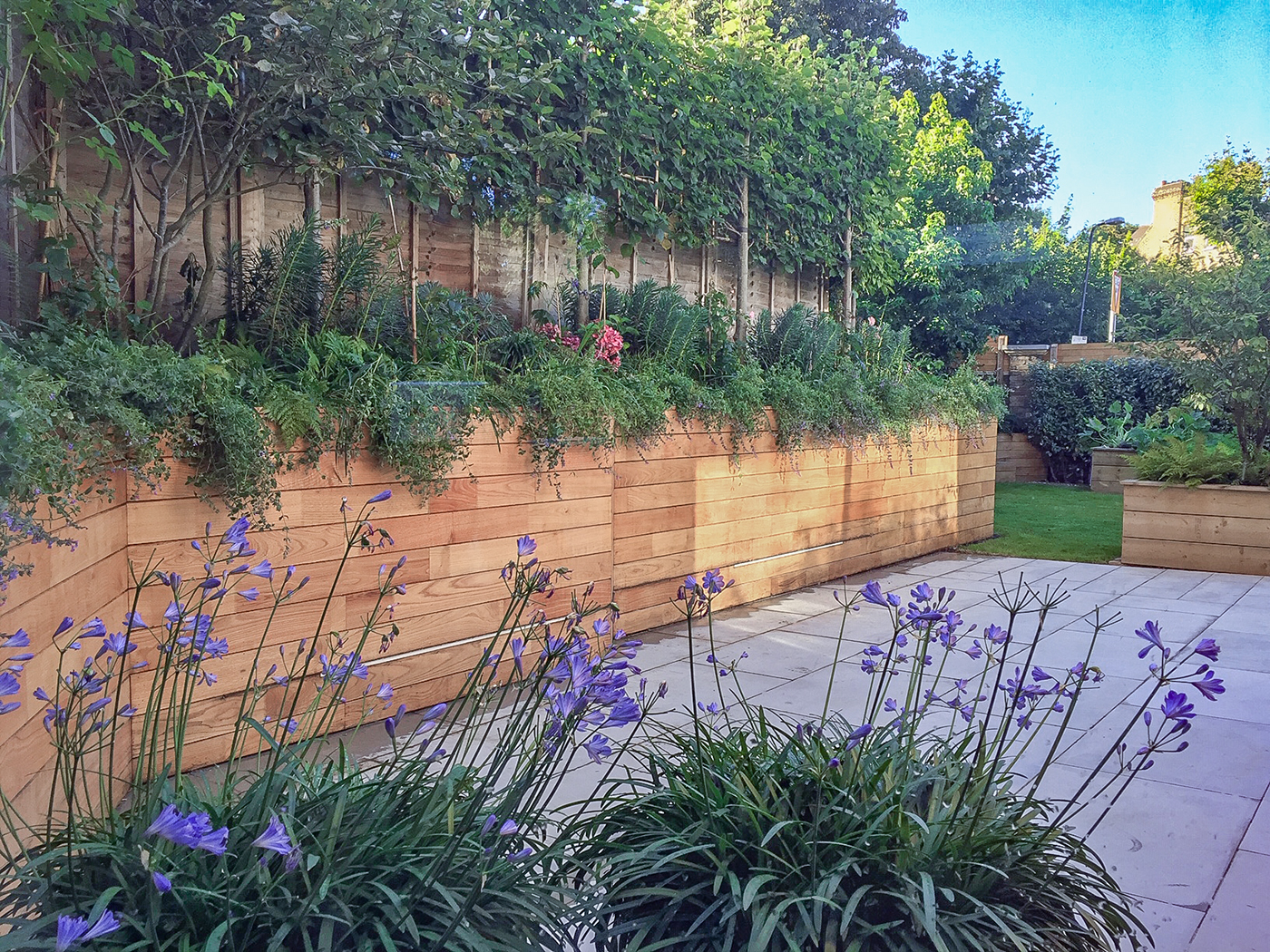 A multi stemmed Betula is planted in front of the window with Alliums and ferns. A side terraced garden at ground level has been created pushing back the earth with a raised planted area and retaining wall faced in cherry wood.