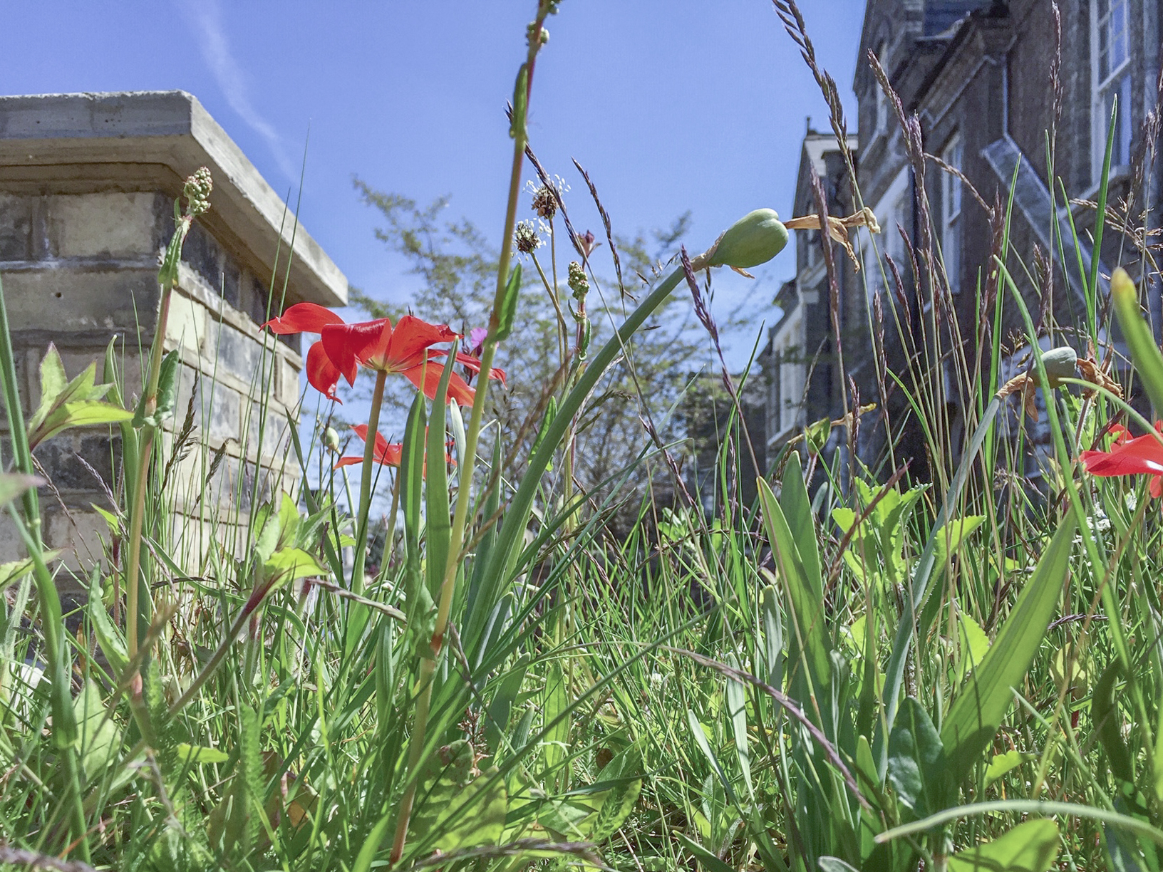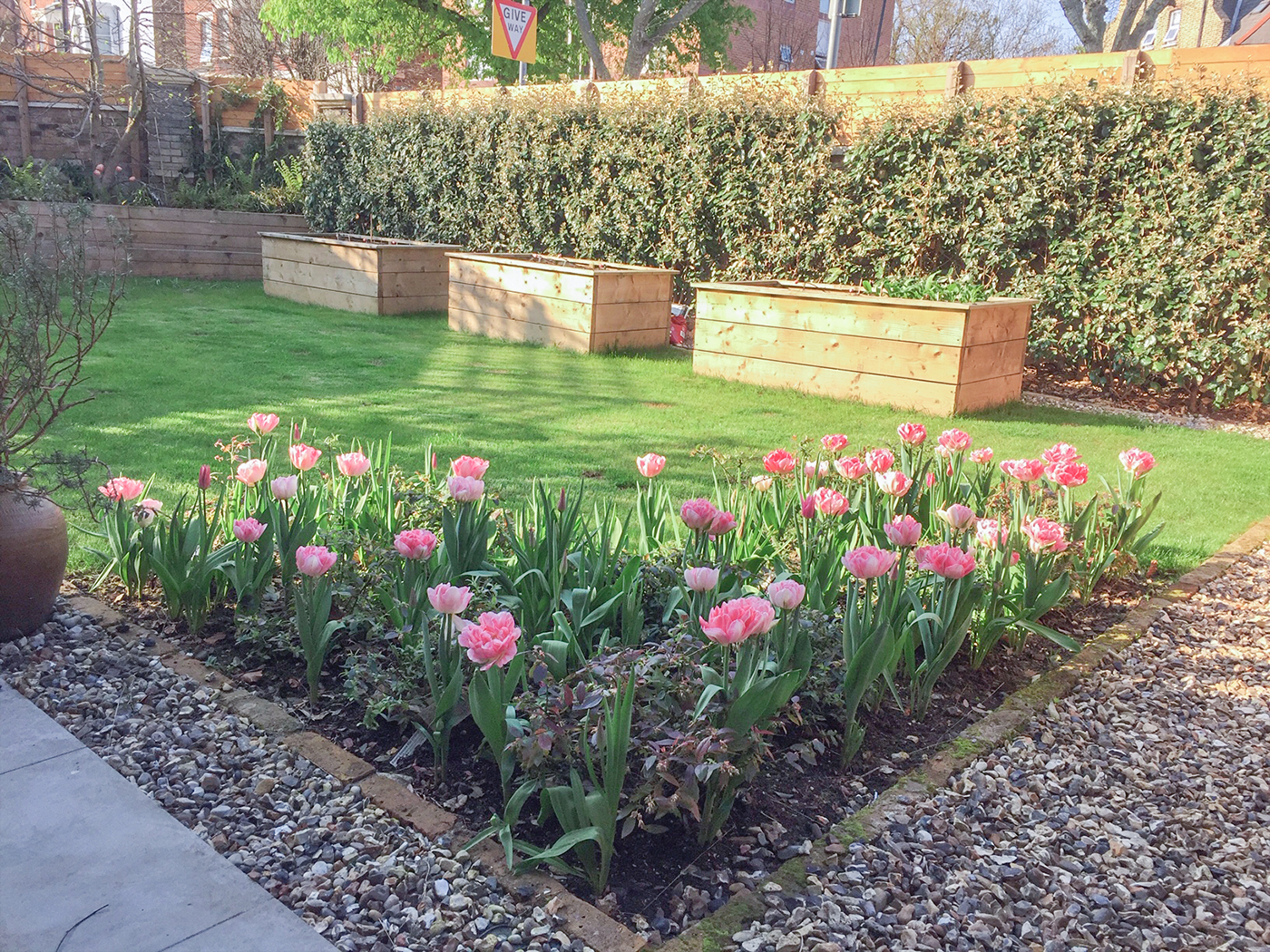 To create a privacy screen here, mature pleached Tilias formed the high level planting and an Amelanchier creates sculptural Winter, Spring and Autumn interest, underplanted with a profusion of Roses, Euphorbias and Nepeta, viewed from below Front garden: the lawn was a challenge. The soil level had been lowered and the unforgiving clay was worked on to provide a good subsurface for the turf.